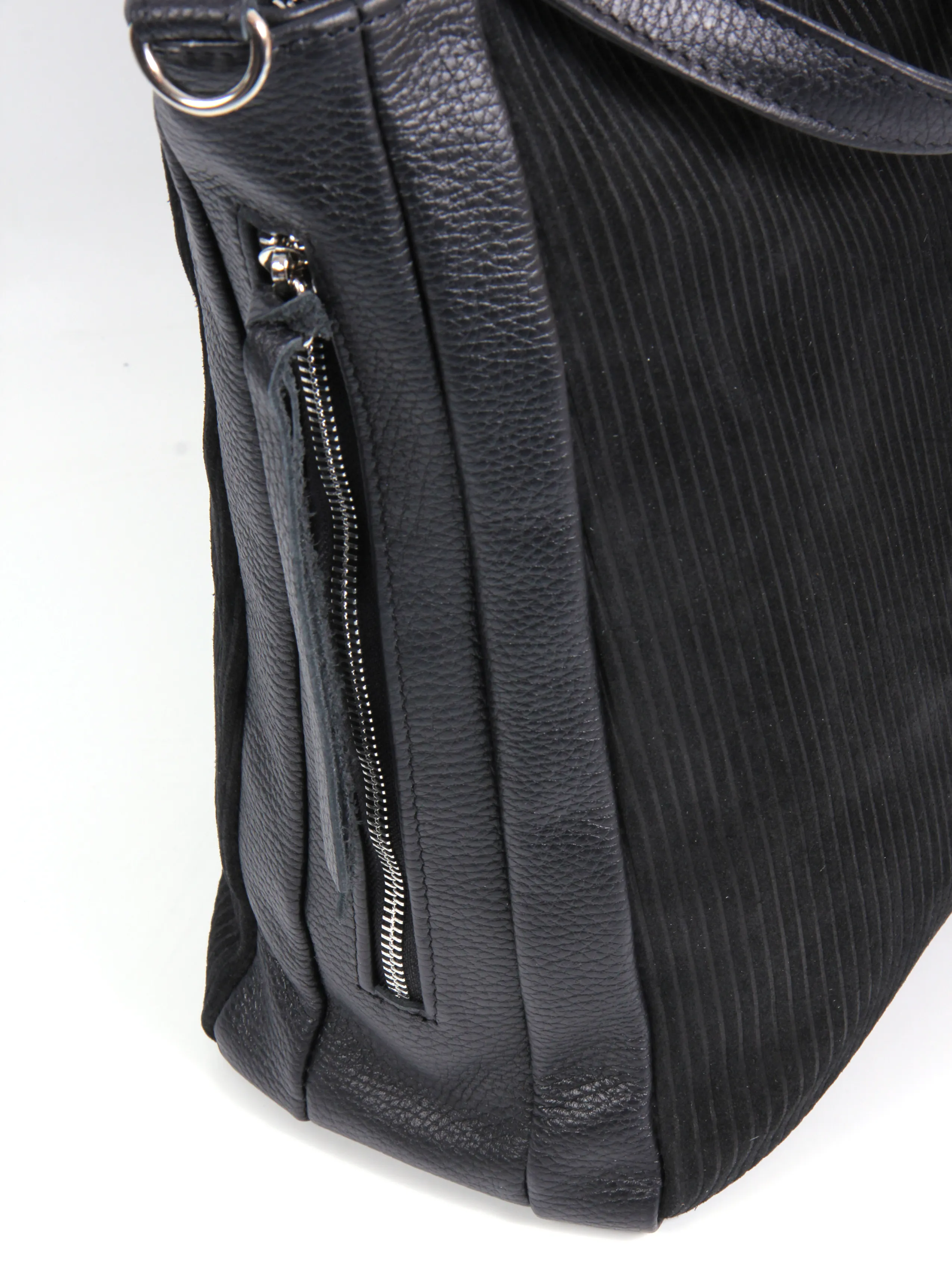 Сумка от бренда Valigetti выполнена из натуральной кожи и замши, выполнена в черном цвете. Модель с двумя короткими ручками и съемным регулируемым плечевым ремнем. Модель с одним отделением на молнии, внутри: текстильная фирменная подкладка, два боковых кармана на молнии и накладной открытый карман. По бокам расположено два кармана на молнии быстрого доступа.