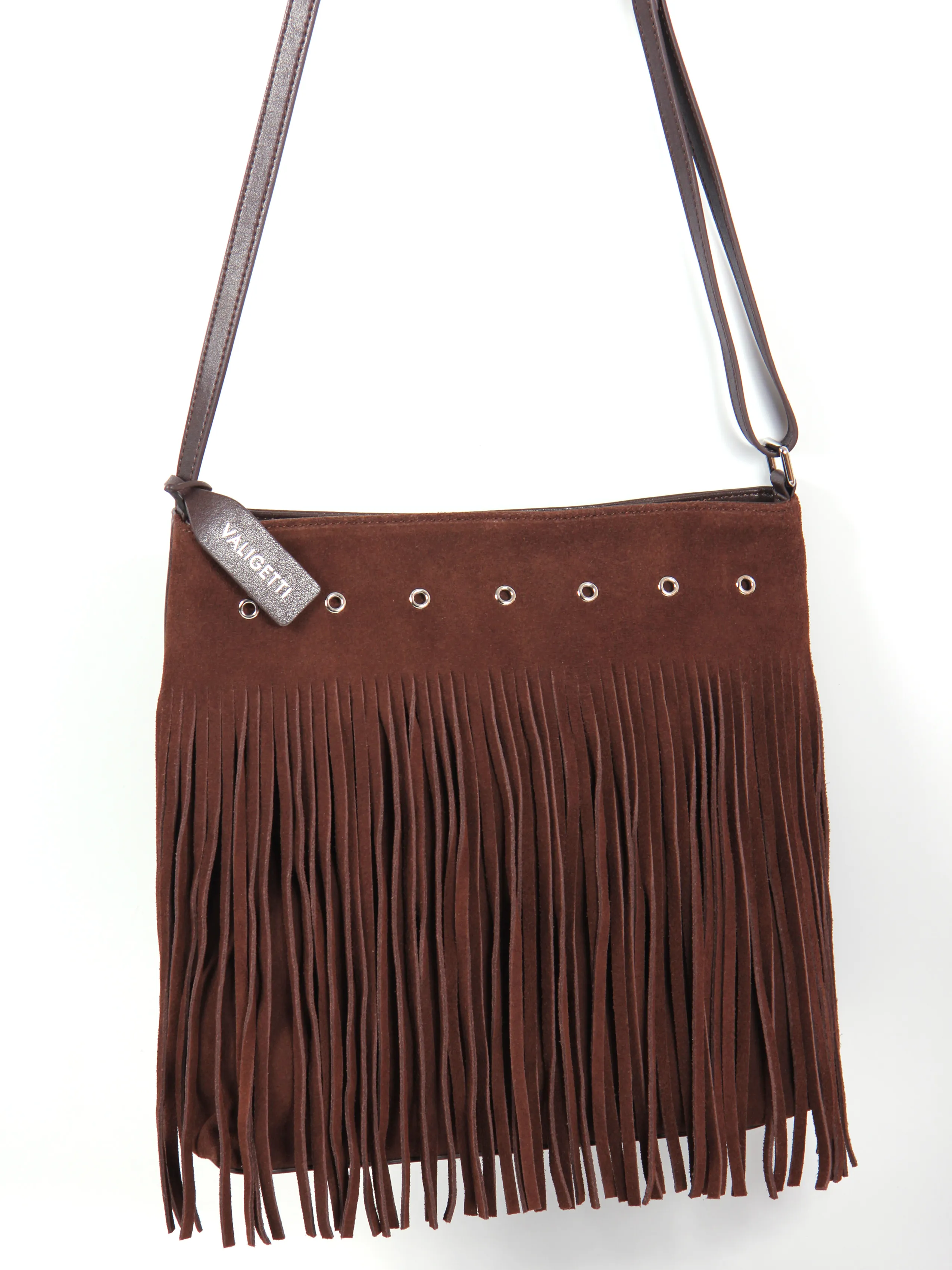 Сумка от бренда Valigetti выполнена из натуральной замши и кожи в коричневом цвете. Модель с несъемным регулируемым плечевым ремнем, часть лицевой стороны состоит из множества тонких замшевых полосок, которые свободно свисают, придавая изделию богемный, непринуждённый вид. Основное отделение на молнии, внутри: фирменная текстильная подкладка, накладной открытый карман и карман на молнии, на задней стороне сумки расположен карман быстрого доступа на молнии.