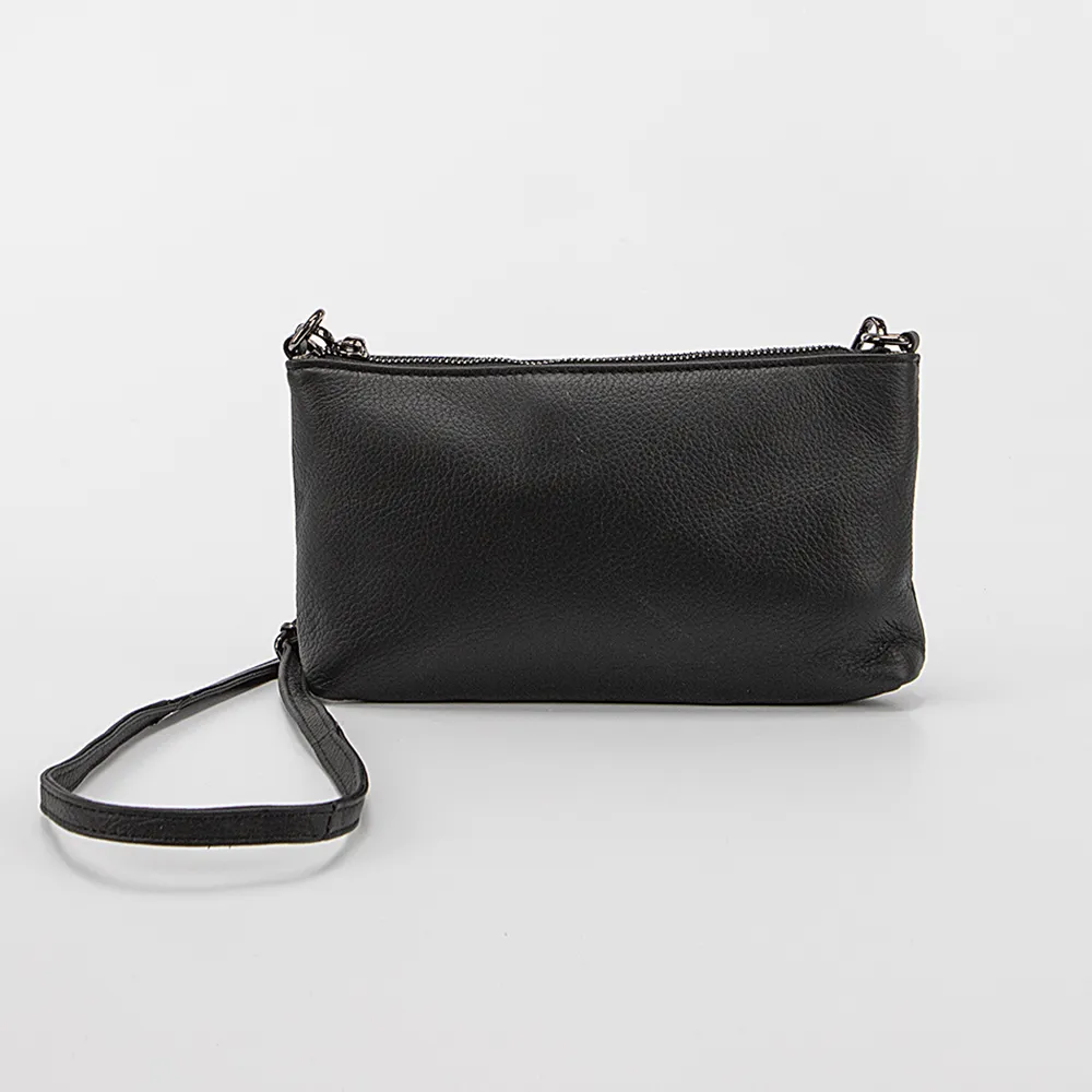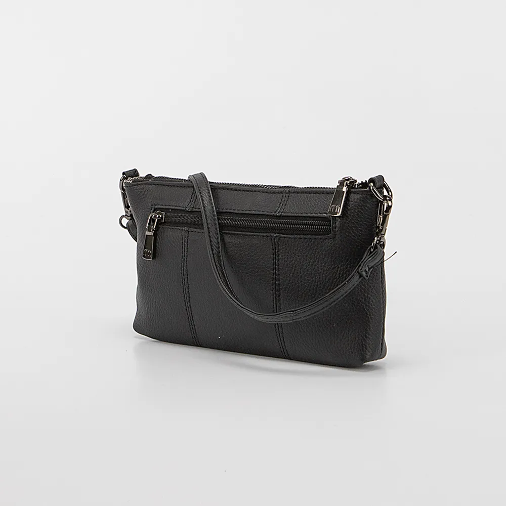 Клатч от торговой марки Poshete из натуральной кожи черного цвета. Модель со съемным регулируемым плечевым ремнем, съемным ремешок для запястья. Отделение на молнии. Внутри: фирменная подкладка, карман на молнии, два накладных кармана, перегородка с карманом на молнии, образующая накладной карман. На задней стороне – карман на молнии.