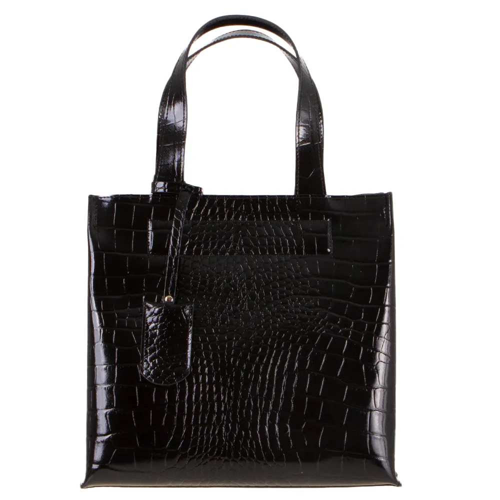 Стильная сумка от торговой марки Galanteya выполнена из натуральной кожи черного цвета с тиснением под крокодиловую кожу. Жесткая модель с двумя удлиненными ручками длиной около 43 см. Отделение на молнии. Внутри: частично на подкладке, жесткий средник на молнии, открытые карманы. На задней стороне – карман на молнии.