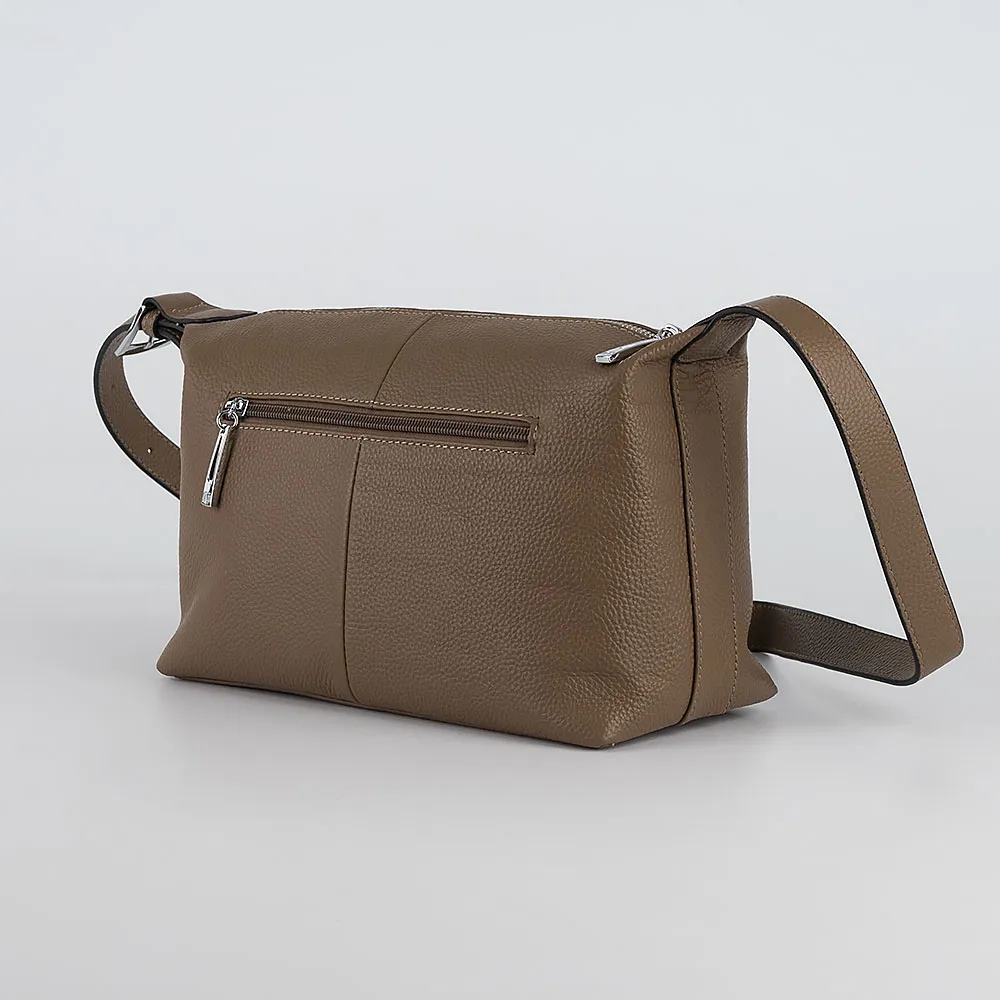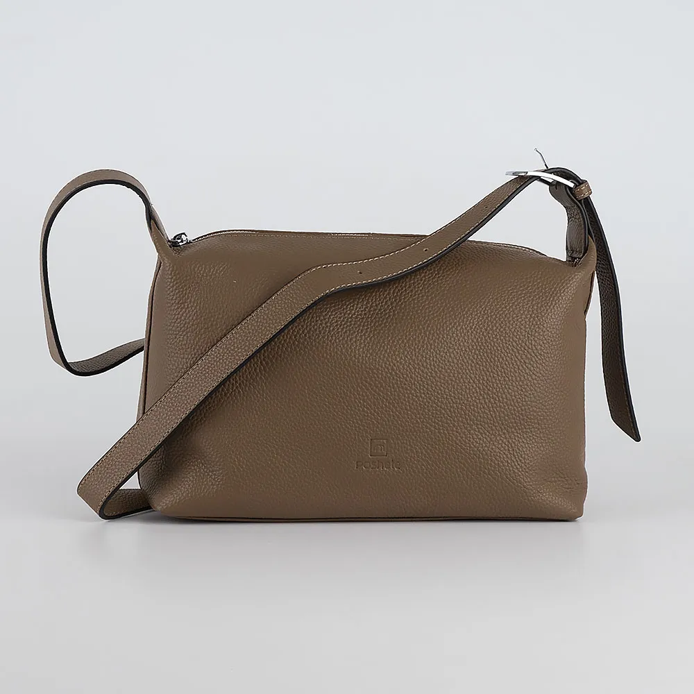 Сумка от торговой марки Poshete из натуральной кожи кофейного цвета. Модель с несъемным плечевым ремнем, регулируемым с одной стороны с помощью пряжки. Отделение на молнии. Внутри: фирменная подкладка, средник и карман на молнии, накладной карман. На задней стороне – карман на молнии.