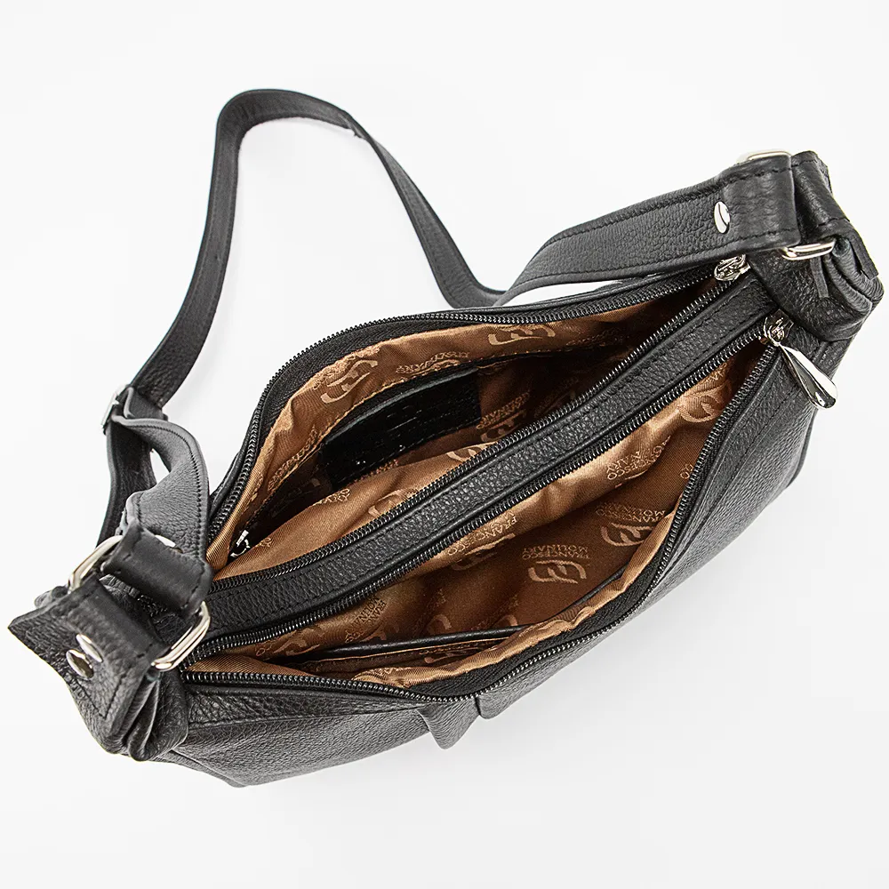 Сумка от торговой марки Francesco Molinary из натуральной кожи черного цвета. Модель с несъемным регулируемым плечевым ремнем. Два отделения на молнии, с текстильной подкладкой. В одном из них – карман на молнии, в другом – накладной карман. На задней стороне – карман на молнии.