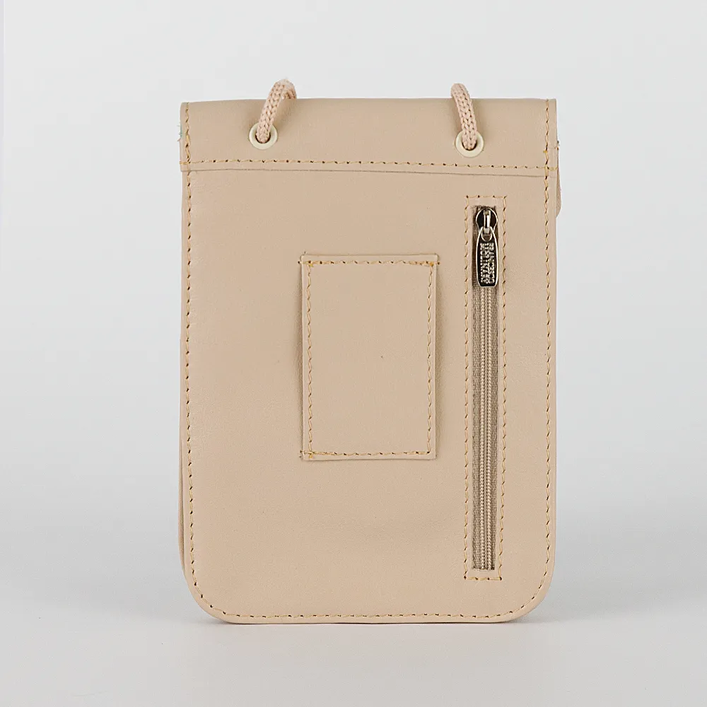 Сумка-визитка от торговой марки Francesco Molinary из натуральной мягкой кожи бежевого цвета. Компактная модель с несъемным нерегули руемым ремешком-веревкой со стоппером. Клапан на магнитной кнопке закрывает карман для карт без застежки и отделение, внутри которого: частичная подкладка, глубокий накладной карман. На лицевой стороне – карман на молнии. На задней стороне – вертикальный карман на молнии, шлевка для ношения сумки на ремне.