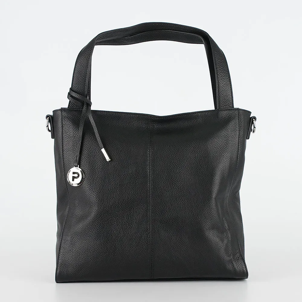 Сумка от торговой марки Poshete из натуральной кожи черного цвета. Модель с двумя удлиненными ручками с декоративной подвеской и съемным регулируемым плечевым ремнем. Отделение на молнии. Внутри: фирменная подкладка, средник и карман на молнии, два накладных кармана. На задней стороне – карман на молнии.
