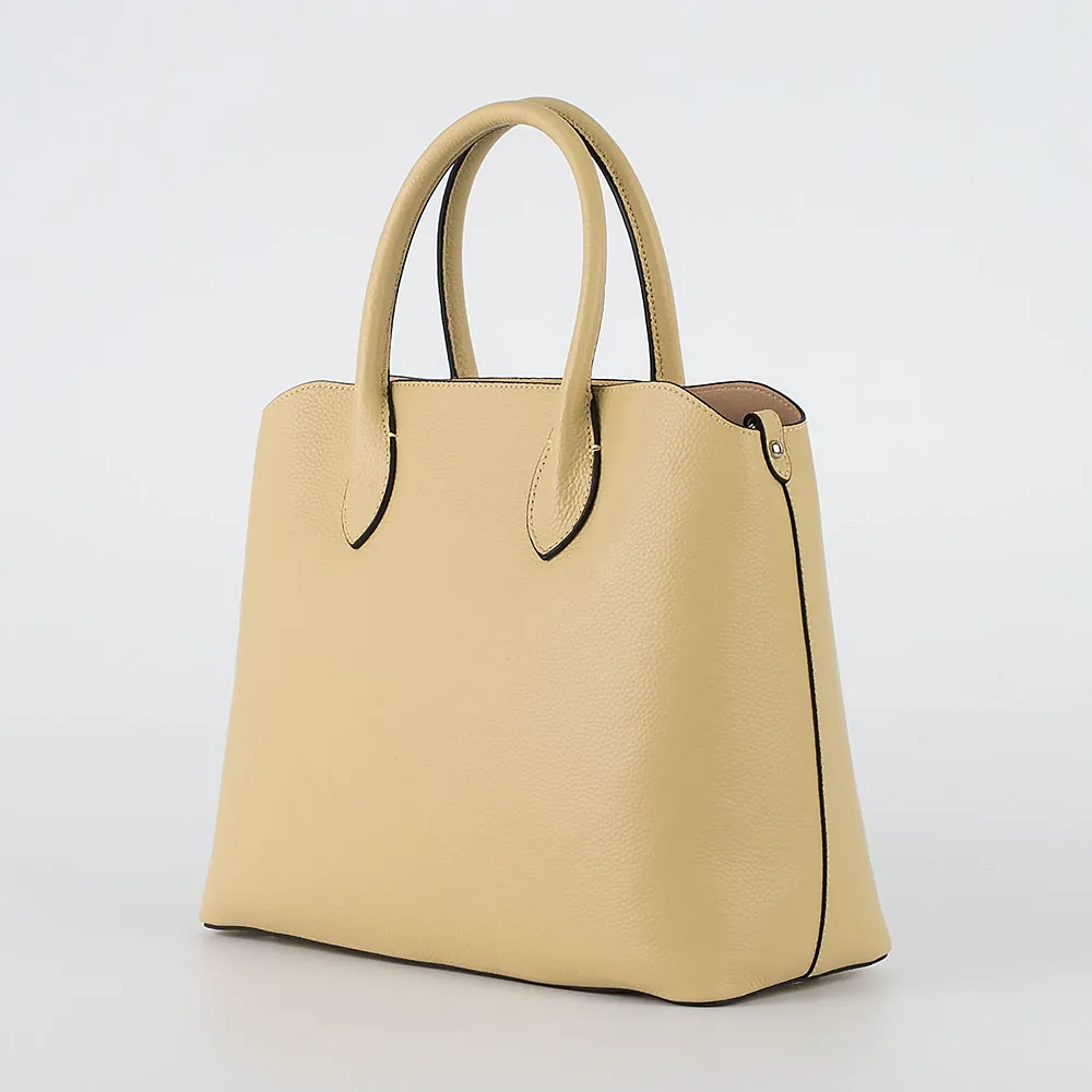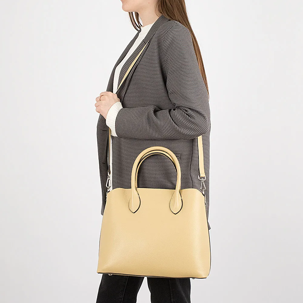 Сумка от торговой марки Poshete из натуральной кожи бледно-желтого цвета. Модель с двумя ручками и съемным регулируемым плечевым ремнем. Отделение с частичной подкладкой. По краям фиксируется магнитной кнопкой. Средник формирует отделение на молнии. Снаружи на нем – карман на молнии. Внутри: карман на молнии, два накладных кармана. Дно оснащено ножками для защиты от износа.