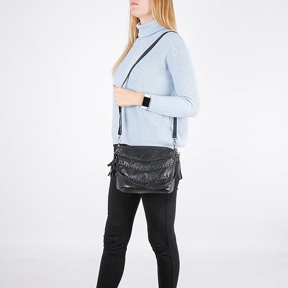 Сумка от торговой марки Passo Avanti выполнена в сочетании искусственной и мягкой натуральной кожи черного цвета. Компактная модель со съемной удлиненной ручкой и съемным регулируемым плечевым ремнем. Отделение на молнии, с текстильной подкладкой и карманами. По бокам декорирована подвесками-кисточками на цепочке. Фигурные кусочки кожи обработаны строчкой «зигзаг»; декорирована кожаными косичками, расположенными «елочкой», и подвесками-кисточками.