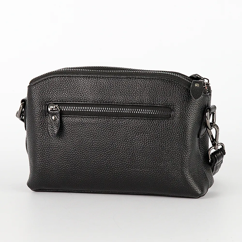 Cумка кросс-боди от торговой марки Poshete выполнена из натуральной крупнозернистой кожи черного цвета. Модель в форме купола, со съемным регулируемым плечевым ремнем, с серебристой фурнитурой. Два отделения на молнии с кожаными пуллерами. Внутри: фирменная подкладка; в одном из них – карман на молнии, в другом – накладной карман. На задней стороне – карман на молнии.