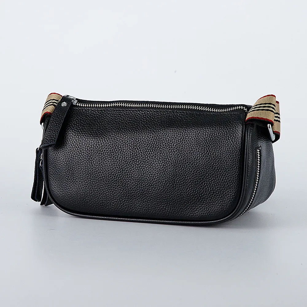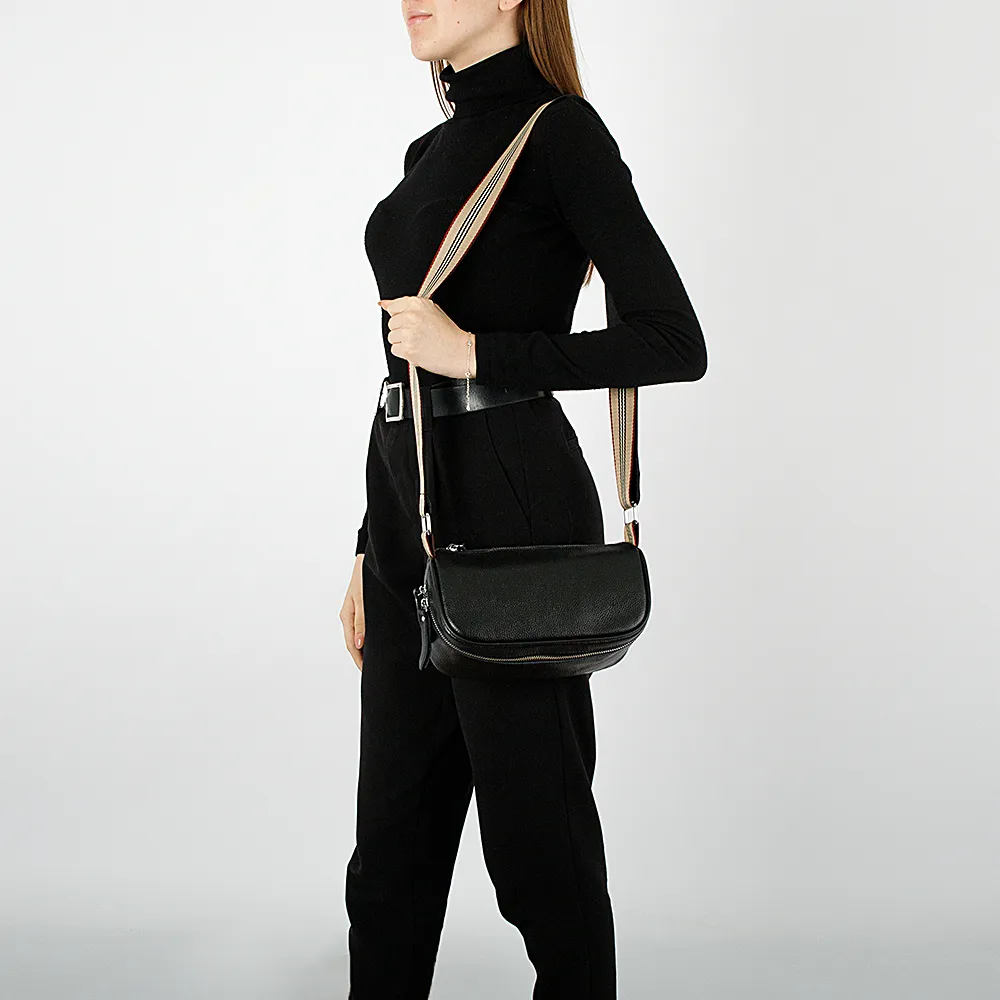 Сумка кросс-боди от торговой марки Poshete из натуральной зернистой кожи черного цвета. Модель с широким несъемным регулируемым плечевым ремнем из текстильного материала с рисунком «в полоску». Отделение на молнии. Внутри: фирменная подкладка, карман на молнии, накладной карман. Нижняя часть по дну декорирована молнией.