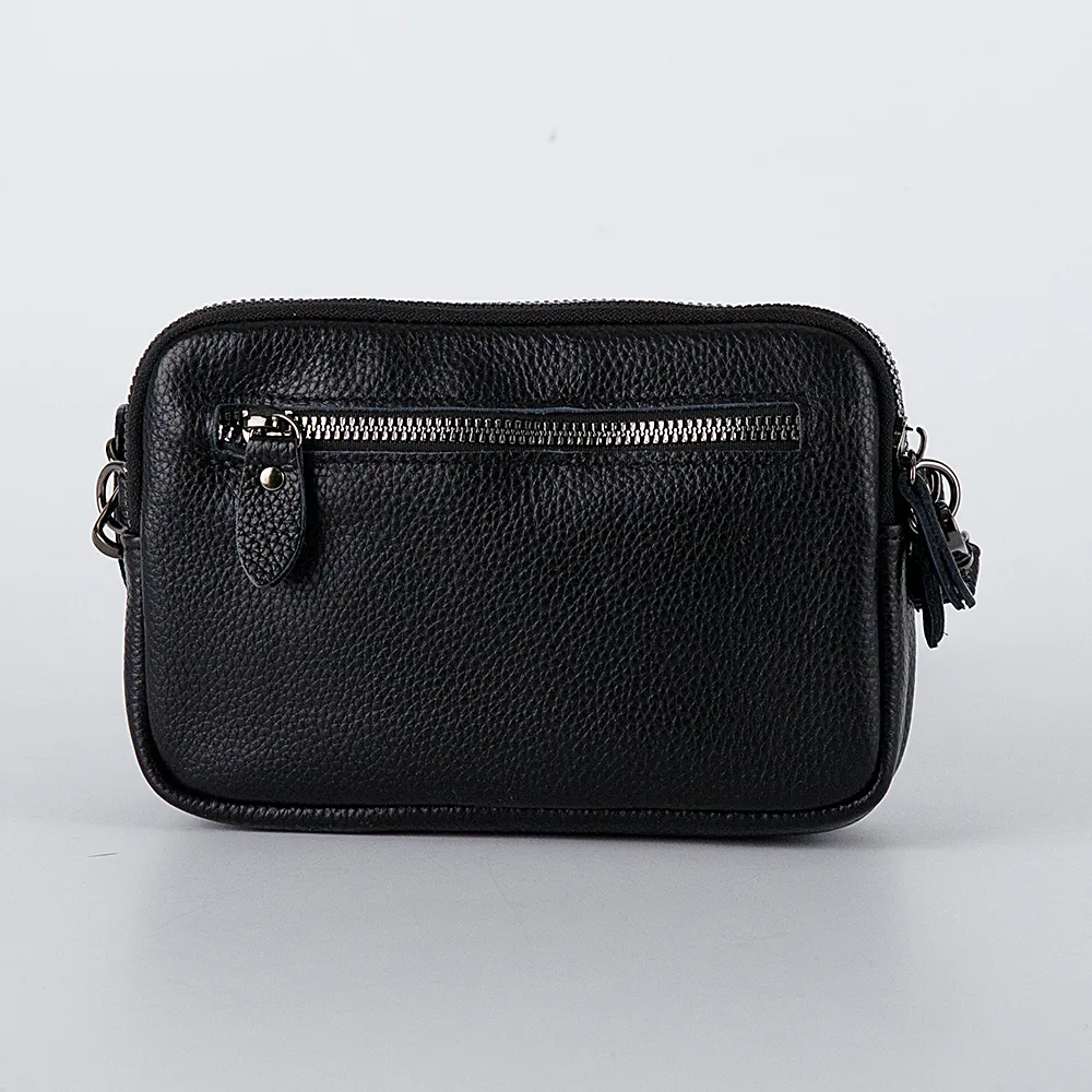 Сумка кросс-боди от торговой марки Poshete из натуральной зернистой кожи черного цвета. Модель со съемным регулируемым плечевым ремнем. Два отделения на молнии с фирменной подкладкой. В одном из них – карман на молнии, в другом – накладной карман. На лицевой стороне – накладной карман на молнии. На задней – прорезной карман на молнии.