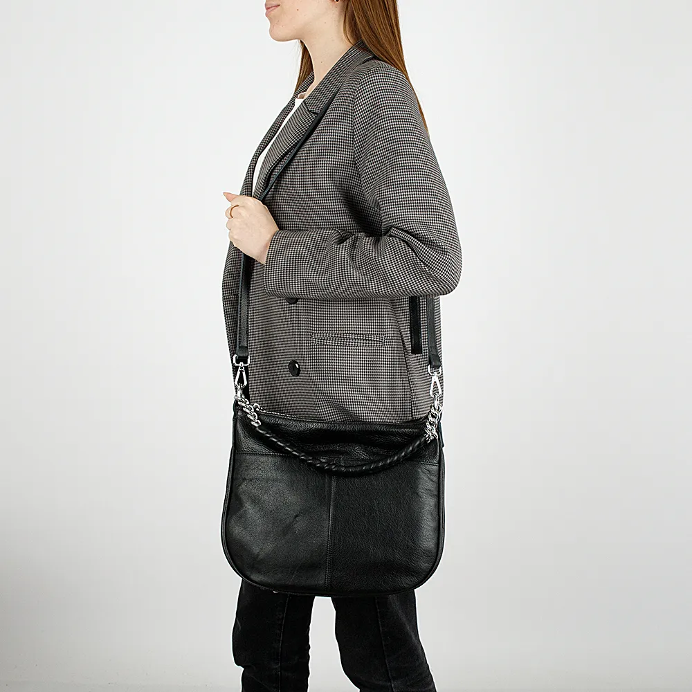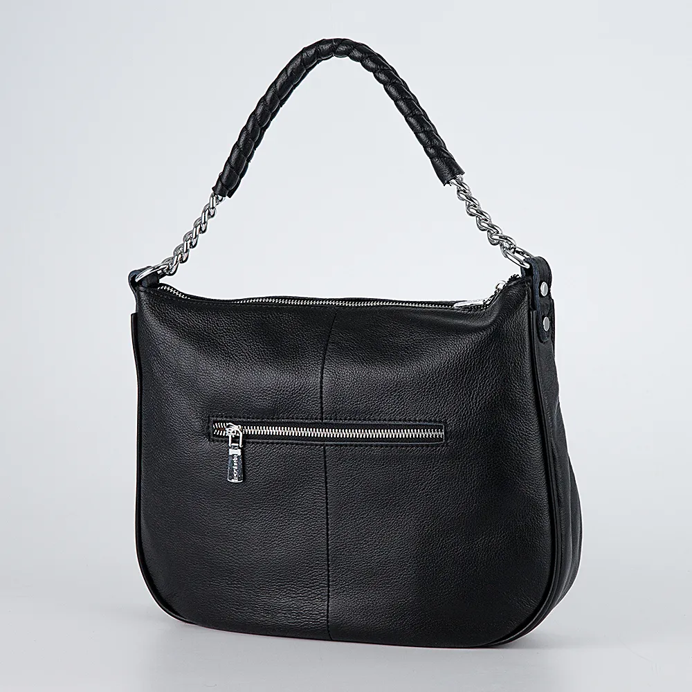 Сумка от торговой марки Poshete выполнена из натуральной кожи черного цвета. Модель с несъемной широкой ручкой-цепочкой и съемным регулируемым плечевым ремнем. Отделение на молнии. Внутри: фирменная подкладка, средник и карман на молнии, накладной карман. На задней стороне – карман на молнии, на лицевой – накладной карман на кнопке.