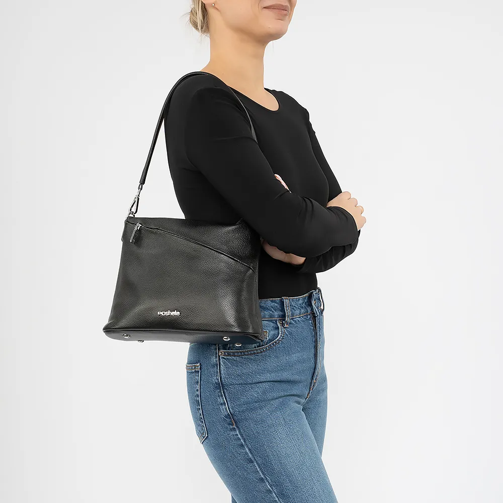 Сумка от торговой марки Poshete из натуральной кожи черного цвета. Модель со съемной ручкой и съемным регулируемым плечевым ремнем. Внутри: фирменная подкладка, средник и карман на молнии, накладной карман. На лицевой стороне – небольшой карман на молнии, на задней стороне – карман на молнии. Дно оснащено ножками для защиты от износа.