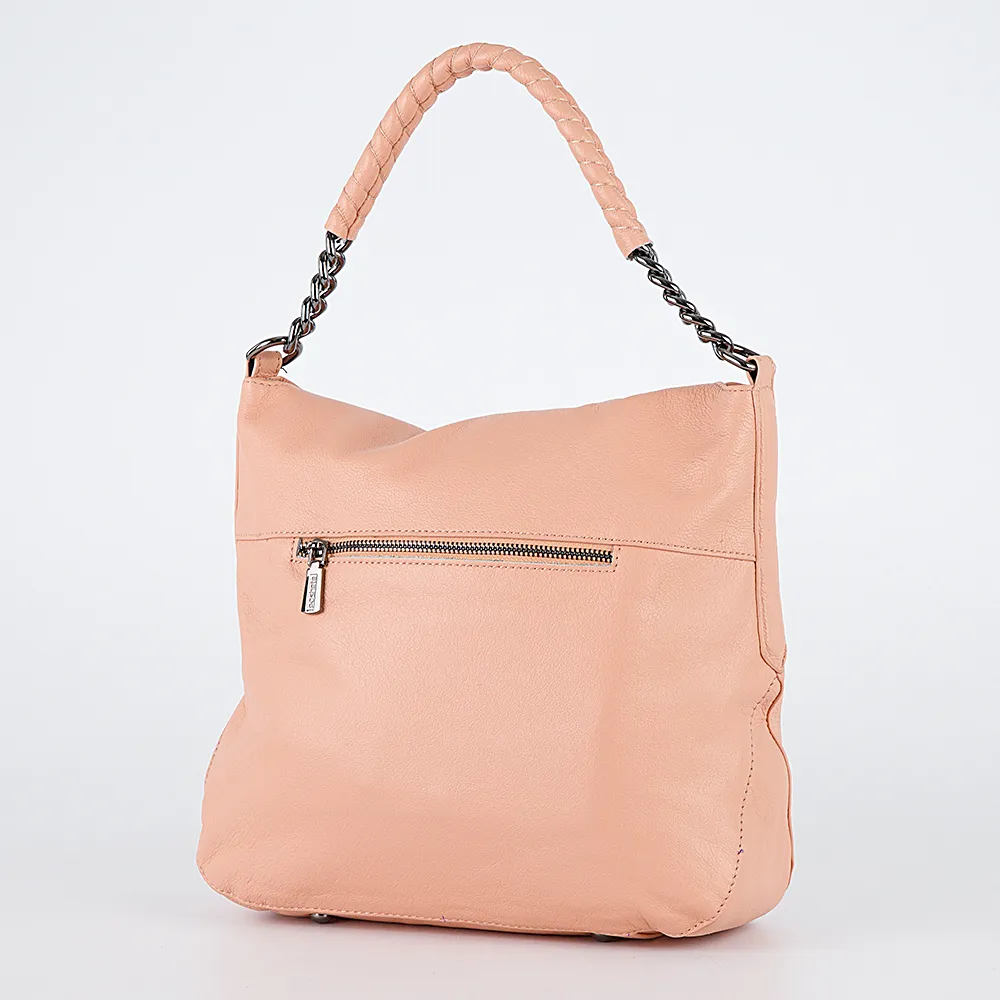Сумка от торговой марки Poshete из натуральной кожи кораллово-розового цвета. Модель с ручкой-цепочкой. Верхняя часть фиксируется скрытым магнитом. Отделение на молнии. Внутри: текстильная подкладка, средник и карман на молнии, накладной карман. На задней стороне – карман на молнии. Дно оснащено ножками для защиты от износа.