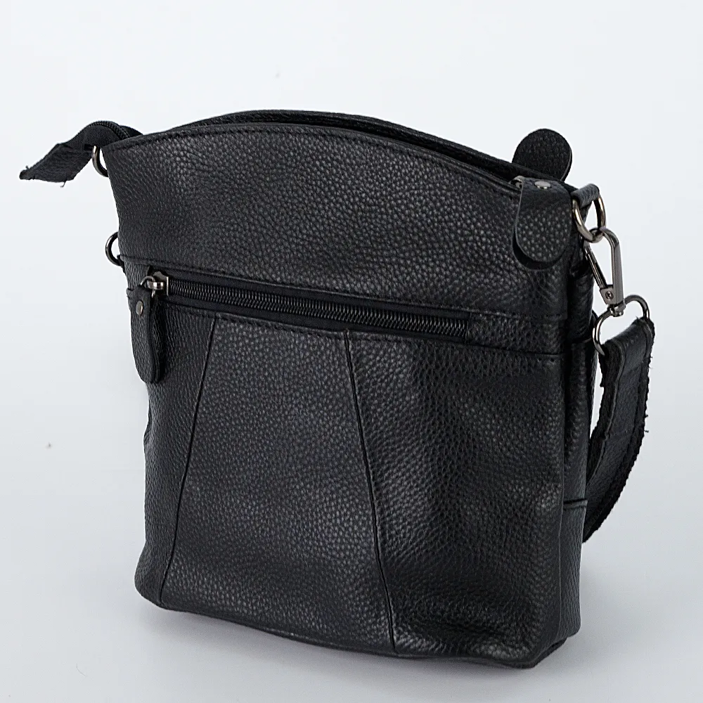 Сумка от торговой марки Poshete из натуральной кожи черного цвета. Модель со съемным регулируемым плечевым ремнем. Отделение на молнии. Внутри: текстильная подкладка, карман на молнии. На лицевой стороне – два кармана на молнии. На задней стороне – карман на молнии.