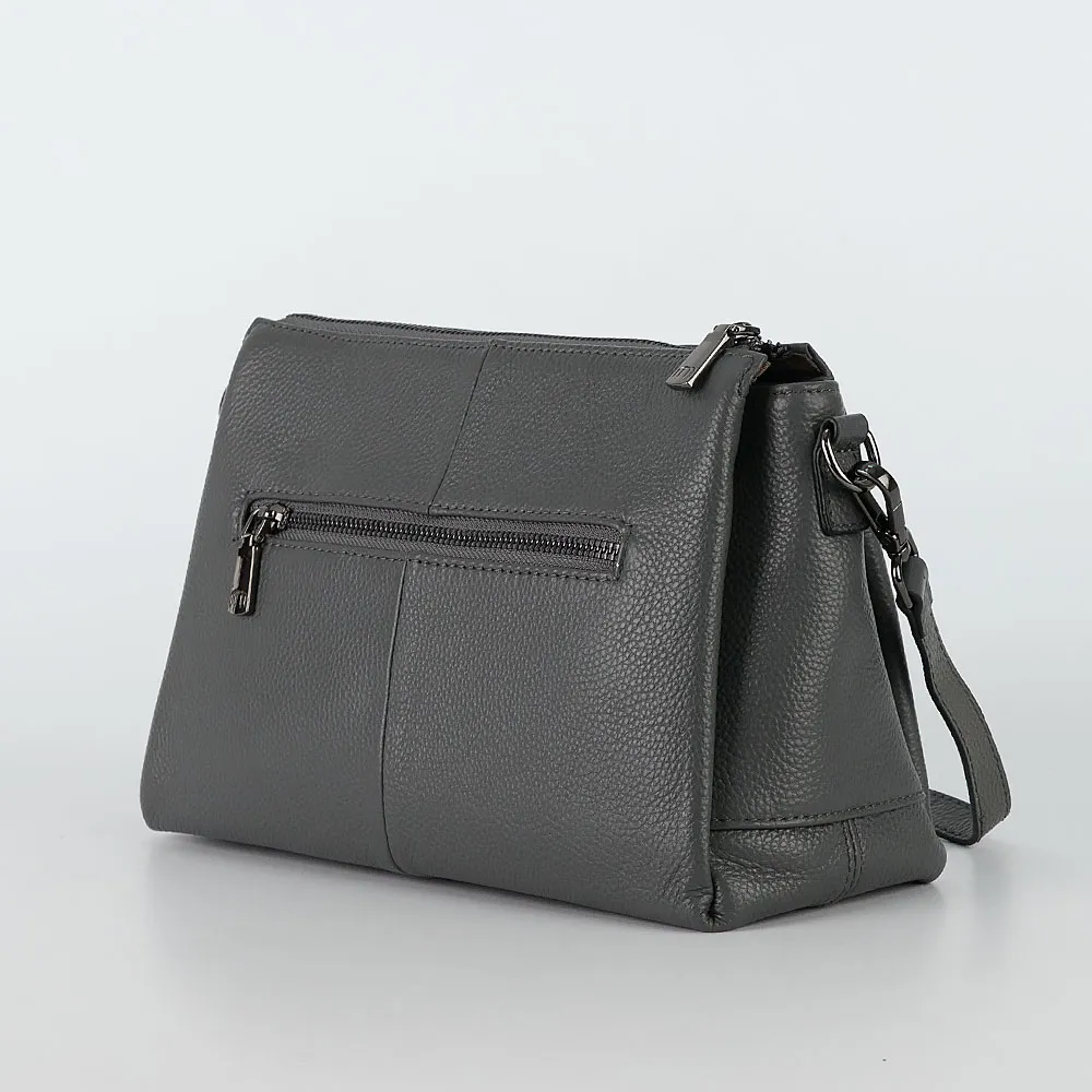 Сумка кросс-боди от торговой марки Poshete из натуральной кожи серого цвета. Модель среднего размера со съемной ручкой и съемным регулируемым плечевым ремнем. Закрывается молнией. Внутри: три отсека с фирменной подкладкой. Среднее отделение на молнии, с карманом на молнии и накладным карманом. На задней стороне – карман на молнии.