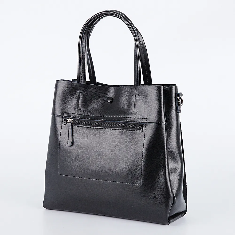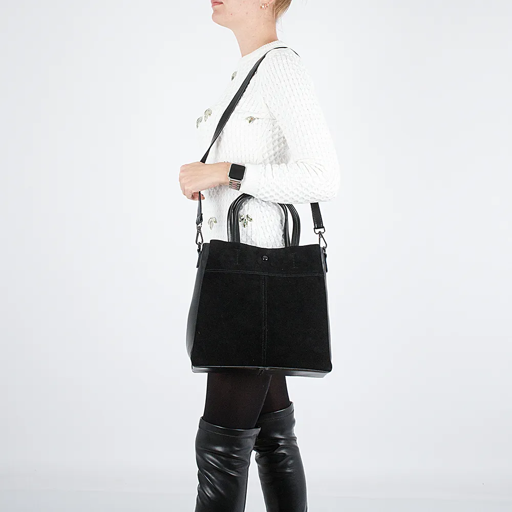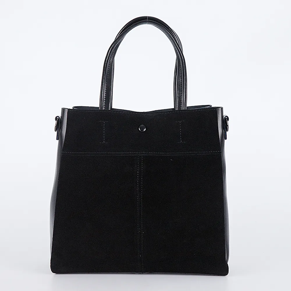 Сумка от торговой марки Poshete из натуральной кожи и замши черного цвета. Модель с двумя ручками и съемным плечевым ремнем. Три отделения с частичной подкладкой; крайние фиксируются магнитной кнопкой. Среднее отделение на молнии; внутри: средник и карман на молнии, два накладных кармана. На задней стороне – карман на молнии.