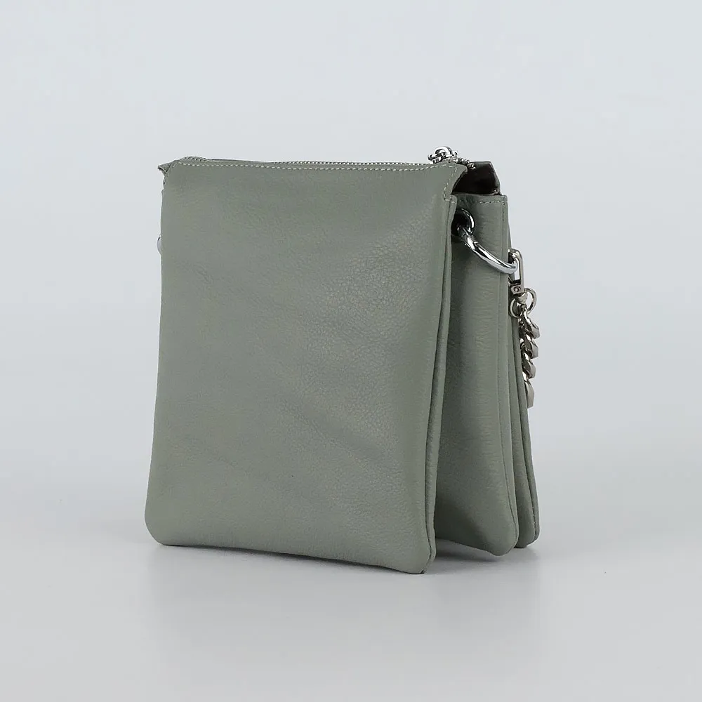 Сумка от торговой марки Poshete из натуральной кожи зеленого цвета. Компактная модель с ручкой-цепочкой с разно-размерными звеньями и съемным регулируемым плечевым ремнем. Закрывается молнией. Внутри: три отсека с текстильной подкладкой; в заднем – карман на молнии.