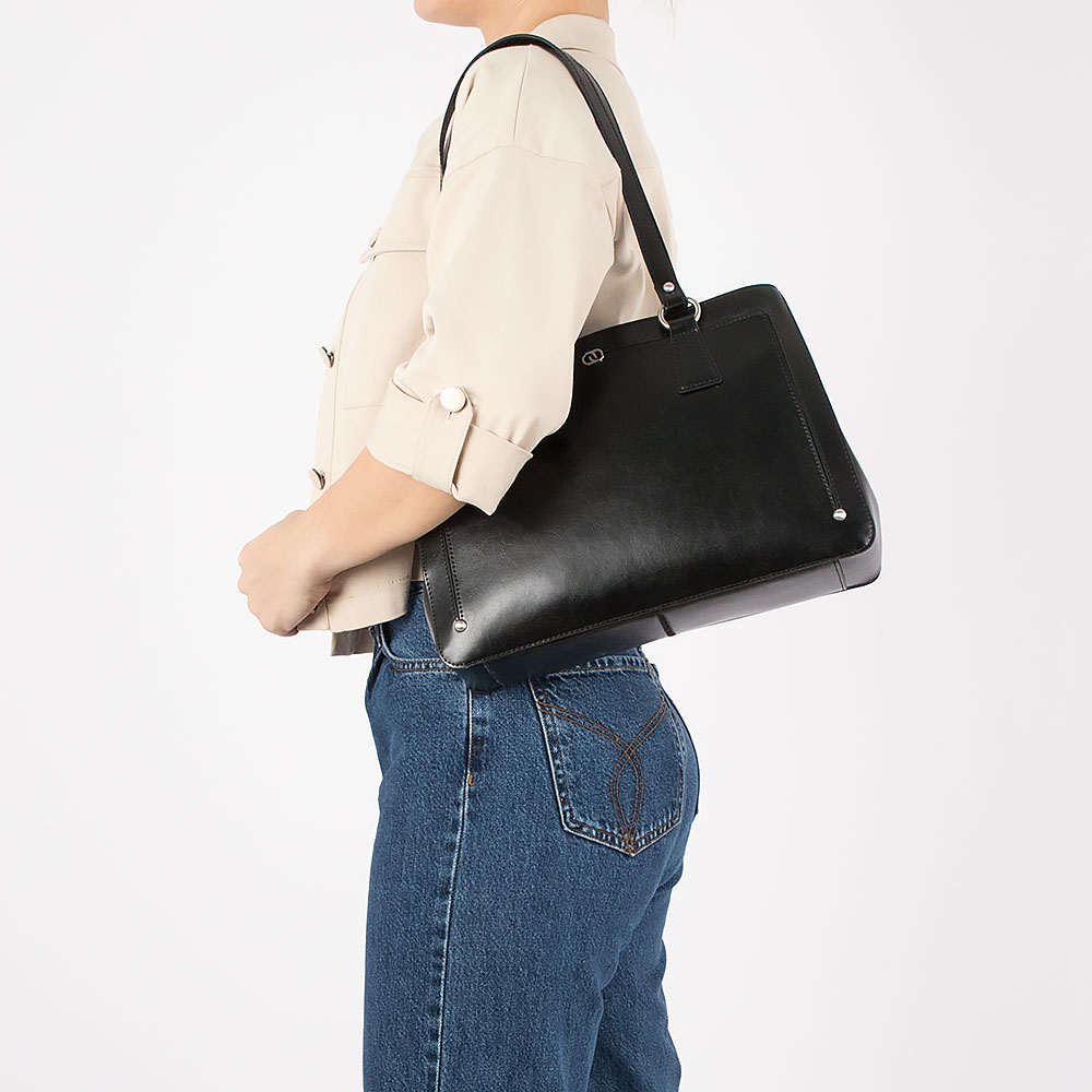 Сумка от торговой марки Francesco Molinary выполнена из натуральной кожи черного цвета. Модель с двумя удлиненными ручками на кольцах-держателях. Два отделения на молнии, с фирменной подкладкой. В одном отделении – два карман на молнии, в другом – карман на молнии. На задней стороне – карман на молнии.
