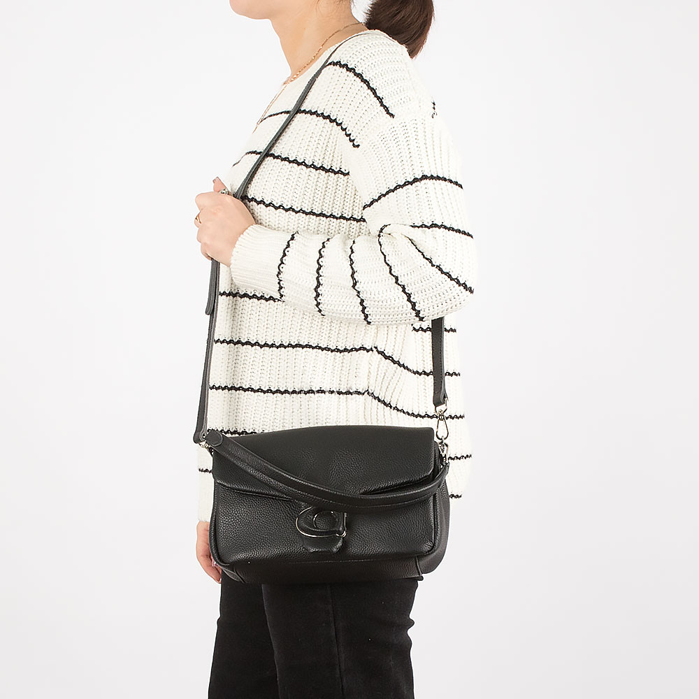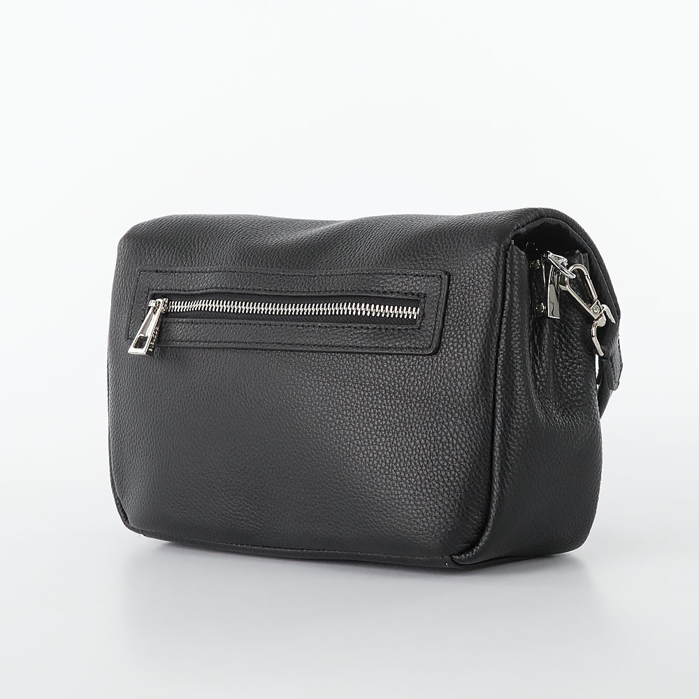 Сумка от торговой марки Poshete из натуральной кожи черного цвета. Модель со съемной ручкой и съемным регулируемым плечевым ремнем. Закрывается клапаном на магнитной кнопке; клапан с оригинальным декором. Внутри: фирменная подкладка, средник и карман на молнии, два накладных кармана. На задней стороне – карман на молнии.