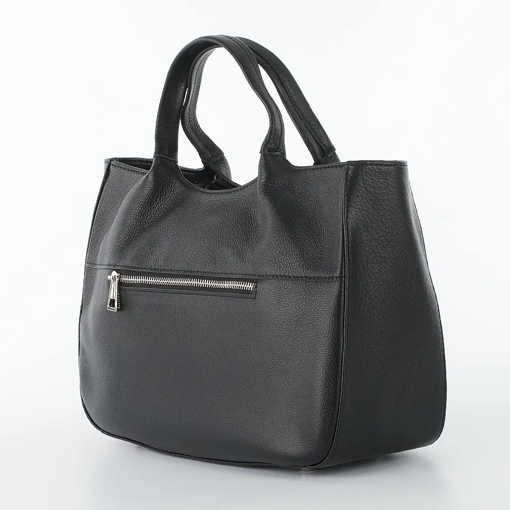 Сумка от торговой марки Poshete из натуральной кожи черного цвета. Вместительная модель с двумя короткими ручками и широким съемным регулируемым плечевым ремнем. Отделение на молнии. Внутри: текстильная подкладка, средник и карман на молнии, два накладных кармана. На задней стороне – карман на молнии. Дно оснащено металлическими ножками для защиты от износа.