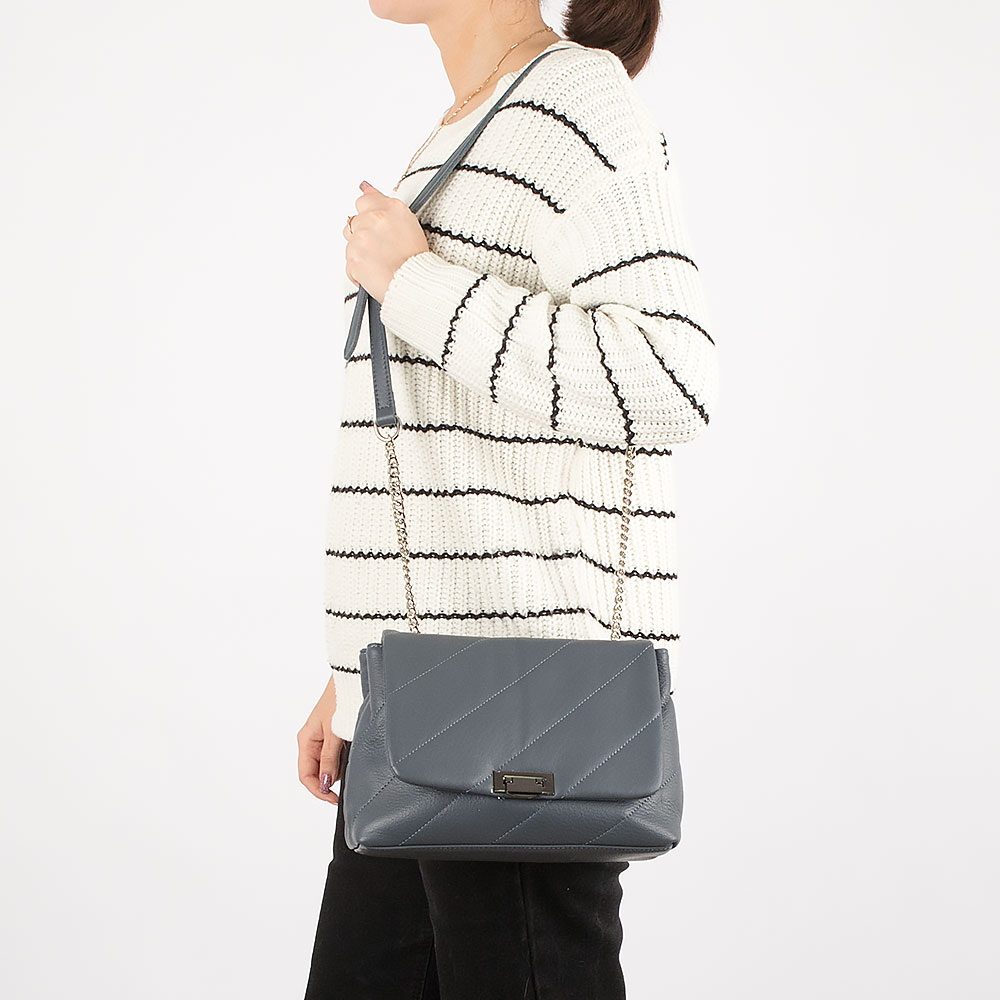 Сумка от торговой марки Poshete из натуральной кожи серого цвета. Декорирована диагональной стежкой. Модель с плечевым ремнем-цепочкой. Закрывается клапаном на поворотном замке. Отделение на молнии. Внутри: фирменная подкладка, средник и карман на молнии, накладной карман. На задней стороне – карман на молнии.