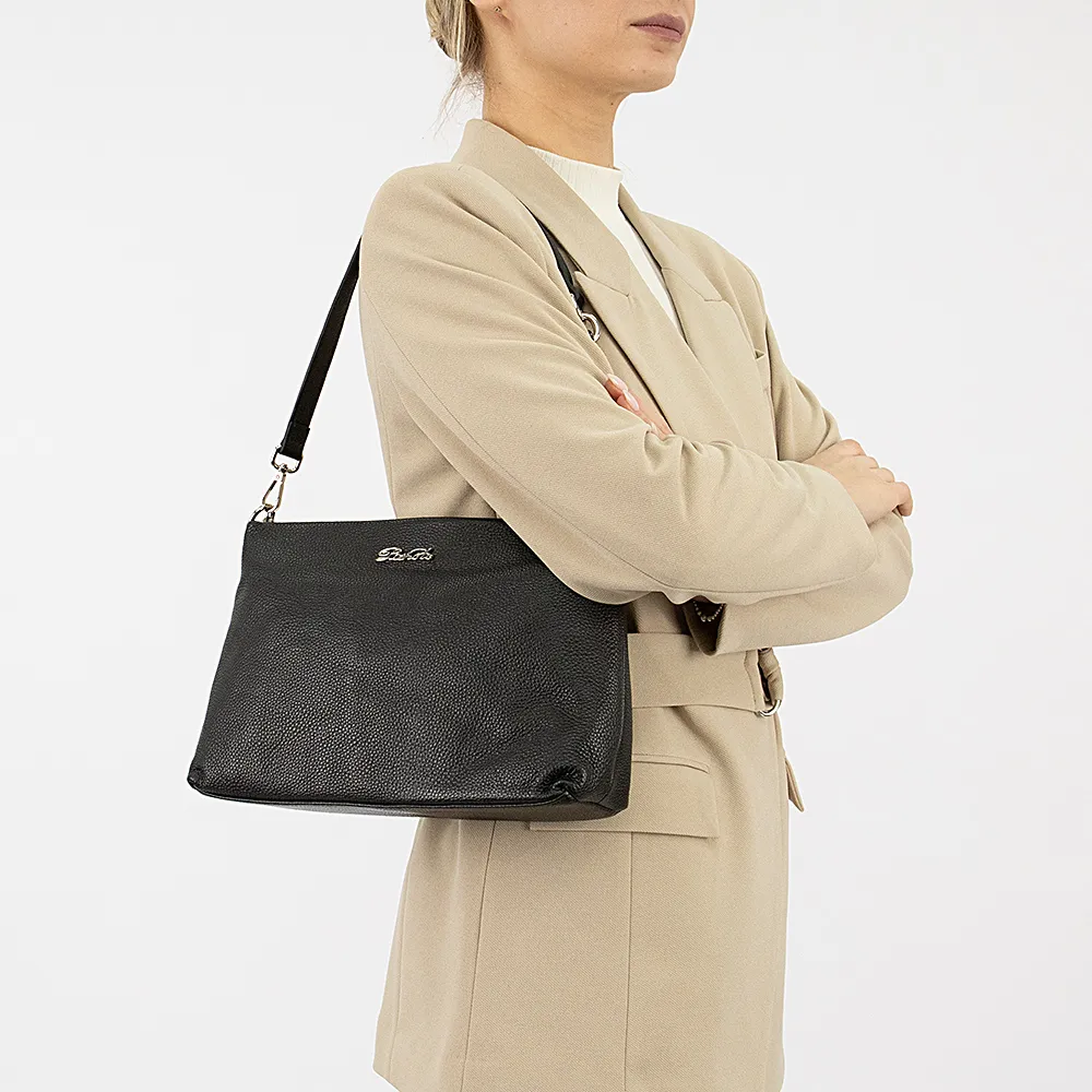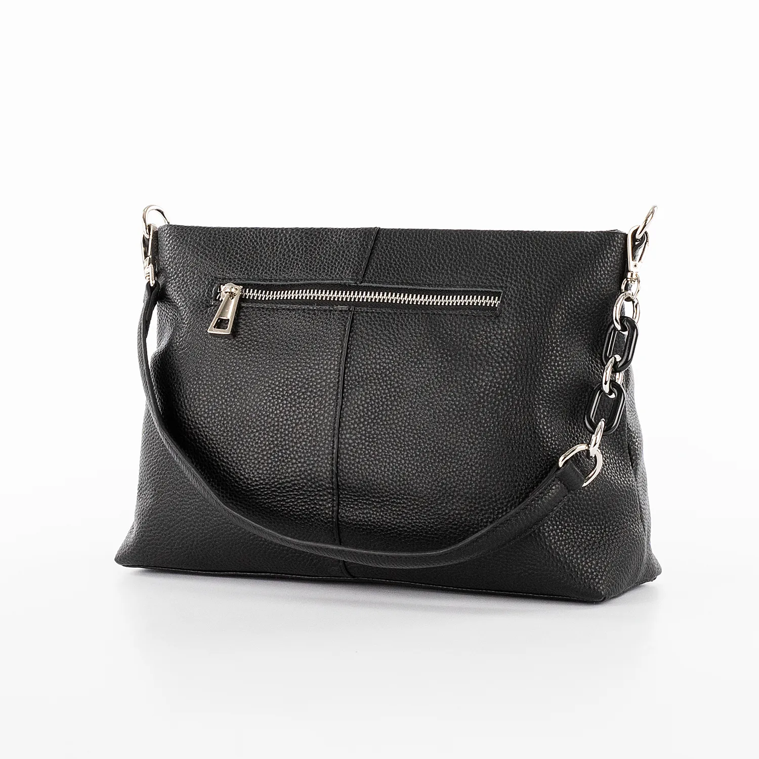 Сумка от торговой марки Poshete из натуральной кожи черного цвета. Модель с удлиненной съемной ручкой-цепочкой и съемным регулируемым плечевым ремнем. Отделение на молнии. Внутри: фирменная подкладка, средник и карман на молнии, два накладных кармана. На задней стороне – карман на молнии.