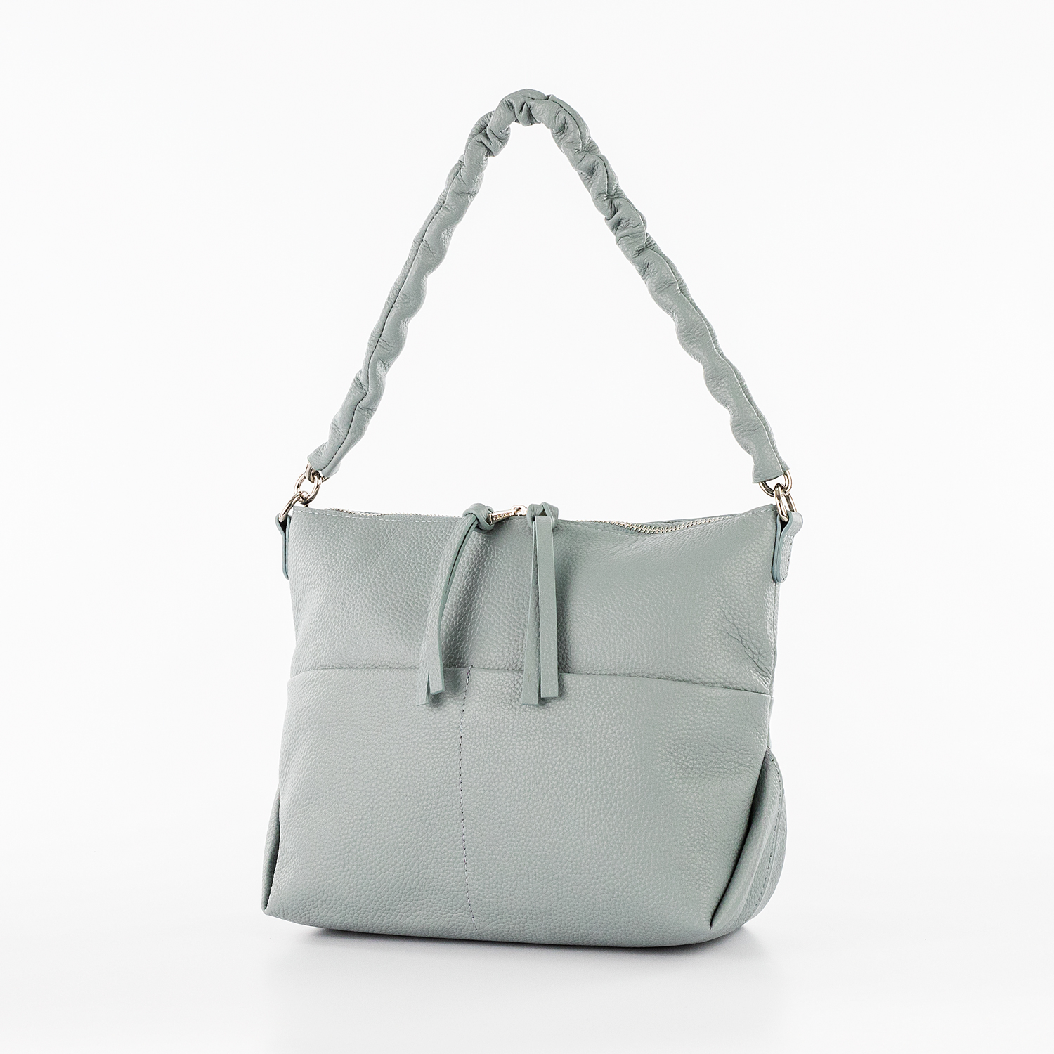 Сумка от торговой марки Poshete из натуральной кожи бледно-голубого цвета. Модель с удлиненной ручкой-цепочкой, обтянутой кожей, и съемным регулируемым плечевым ремнем. Отделение на молнии. Внутри: фирменная подкладка, средник и карман на молнии, два накладных кармана. На лицевой и задней сторонах – по два накладных кармана без застежки.