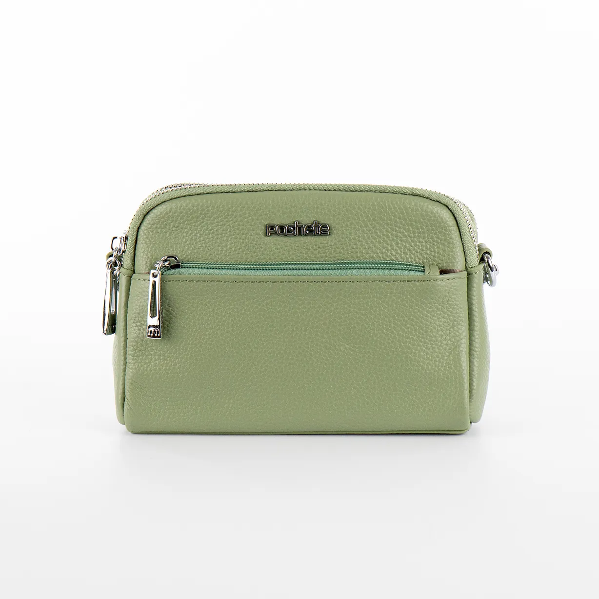 Сумка-планшет от торговой марки Poshete из натуральной кожи светло-зеленого цвета. Компактная модель со съемным регулируемым плечевым ремнем. Два отделения на молнии, с фирменной подкладкой. В заднем - карман на молнии, в переднем – накладной - карман. На лицевой и задней сторонах – карман на молнии.