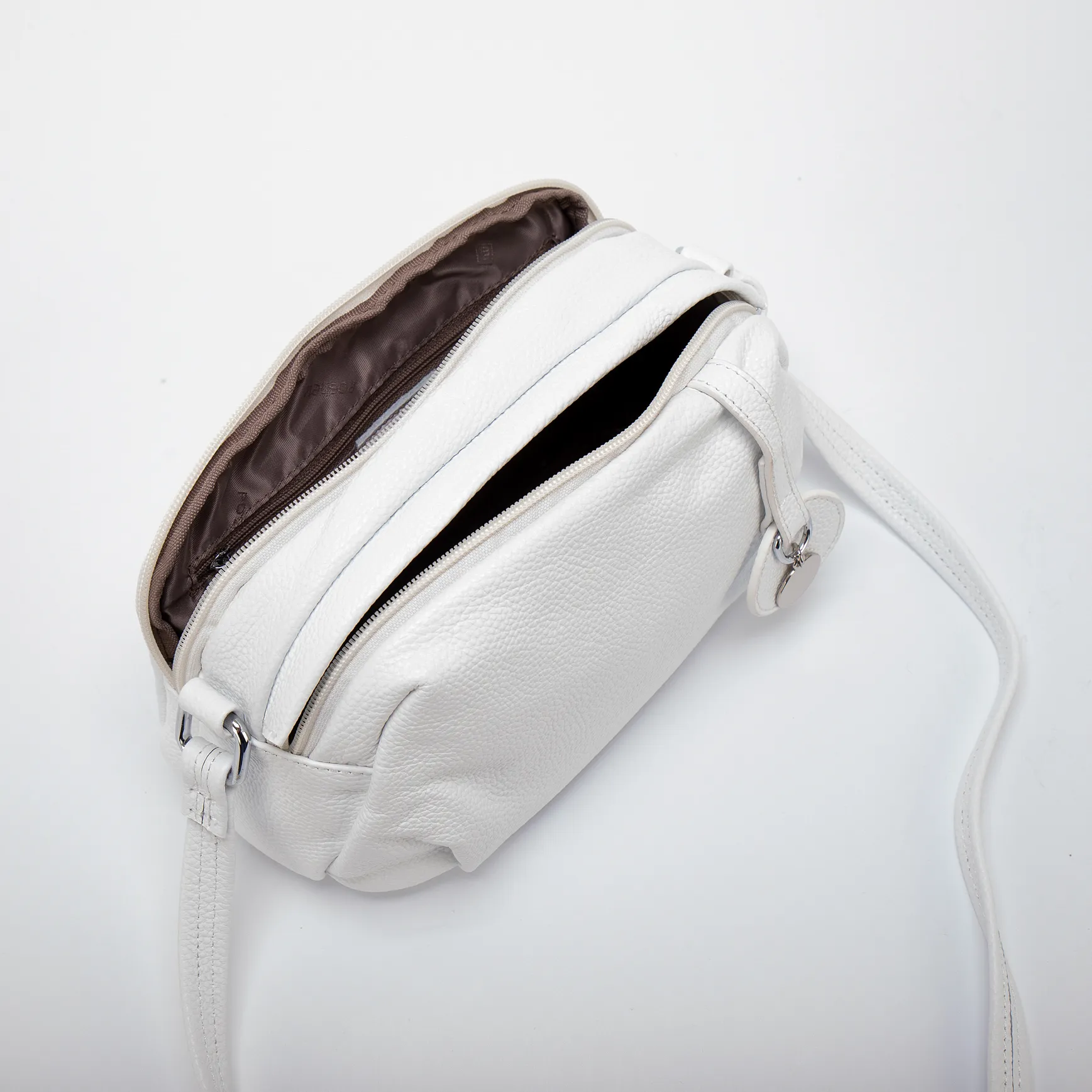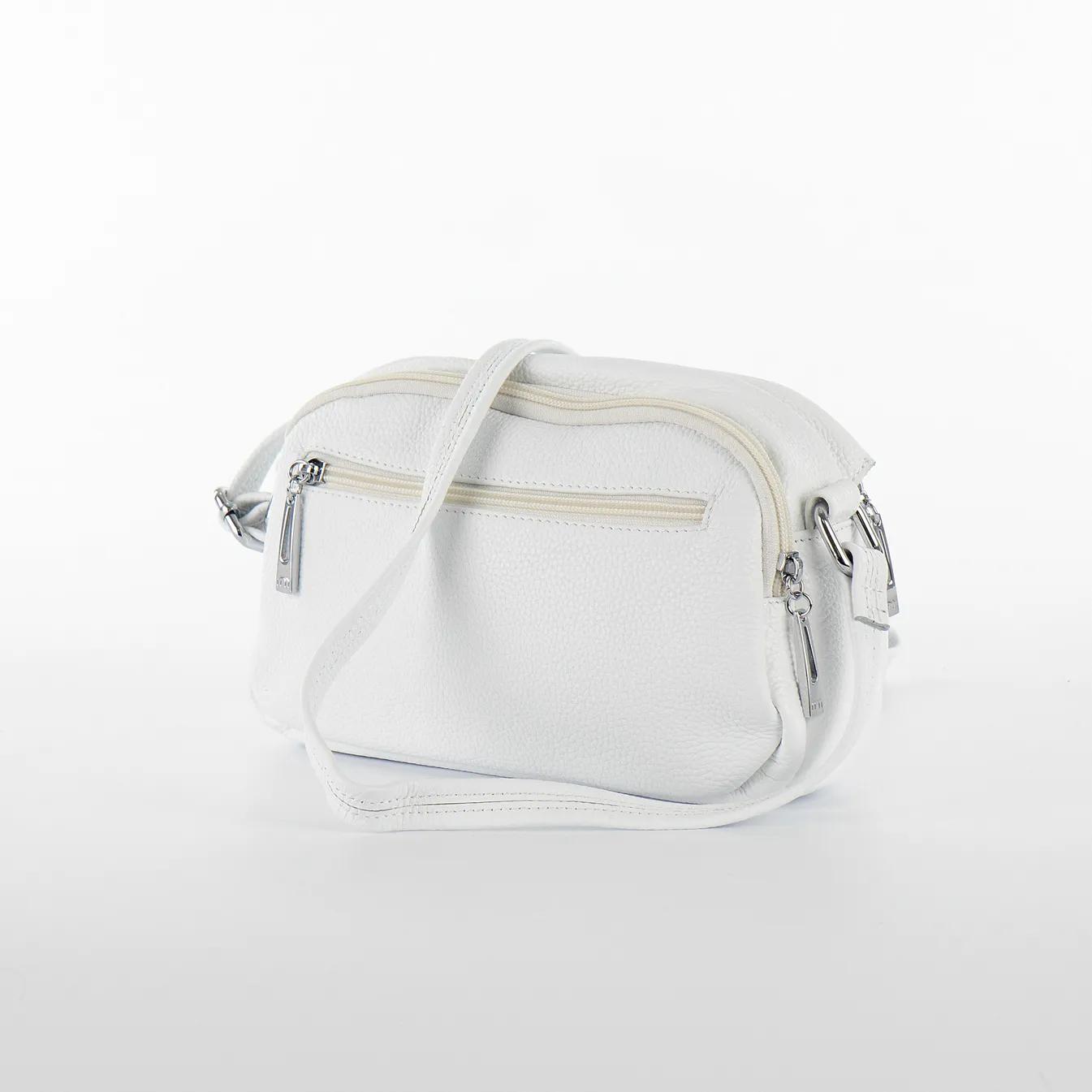 Сумка-планшет от торговой марки Poshete из натуральной кожи белого цвета. Модель с несъемным регулируемым плечевым ремнем. Два отделения на молнии, с фирменной подкладкой. В заднем отделении – карман на молнии. Лицевая сторона декорирована несъемным декоративным ремешком с подвеской. На задней стороне – карман на молнии.