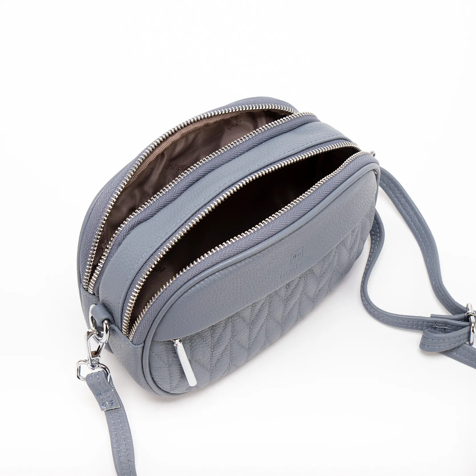 Сумка-планшет от торговой марки Poshete из натуральной кожи голубого цвета. Компактная модель со съемным регулируемым плечевым ремнем. Два отделения на молнии, с фирменной подкладкой. В заднем отделении – карман на молнии. На лицевой и задней сторонах – карман на молнии. Лицевая сторона декорирована узорной стежкой.