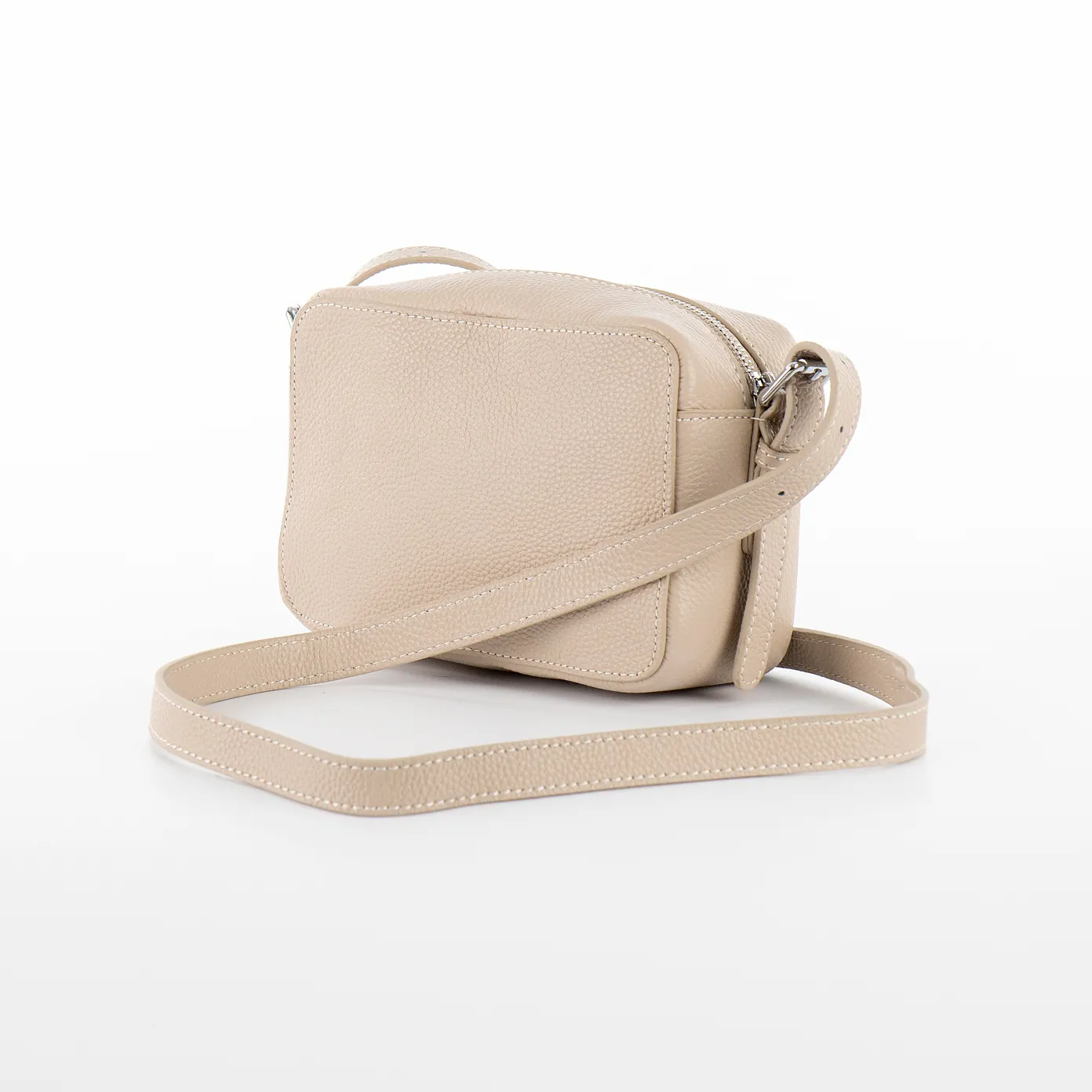 Сумка-планшет от торговой марки Poshete из натуральной кожи светло-бежевого цвета. Компактная полужесткая модель в форме короба с несъемным регулируемым плечевым ремнем. Отделение на молнии. Внутри: фирменная подкладка, кожаный накладной карман для карт. На лицевой стороне – накладной карман на скрытом магните.