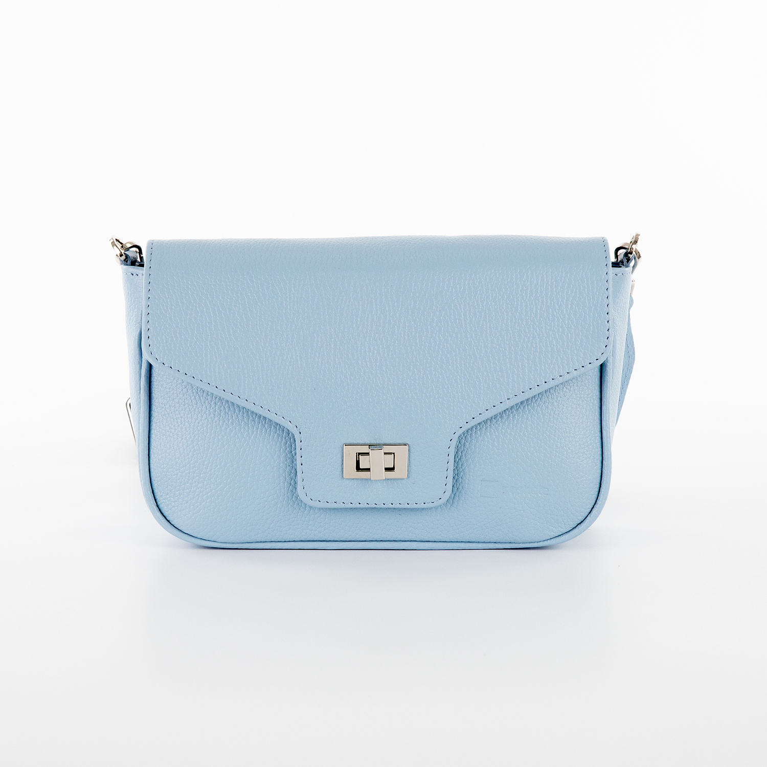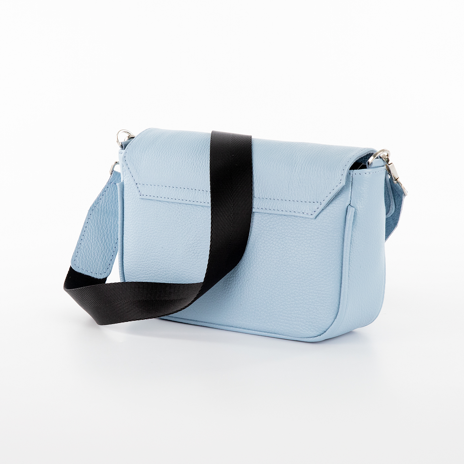 Сумка кросс-боди от торговой марки Poshete из натуральной кожи голубого цвета. Модель с широким съемным регулируемым плечевым ремнем, выполненным из текстильного материала с колечком, к которому крепится кошелек; кошелек с отделением на молнии, без подкладки. Сумка закрывается клапаном на поворотном замке. В отделении: фирменная подкладка, два кармана на молнии.