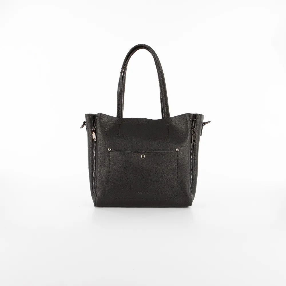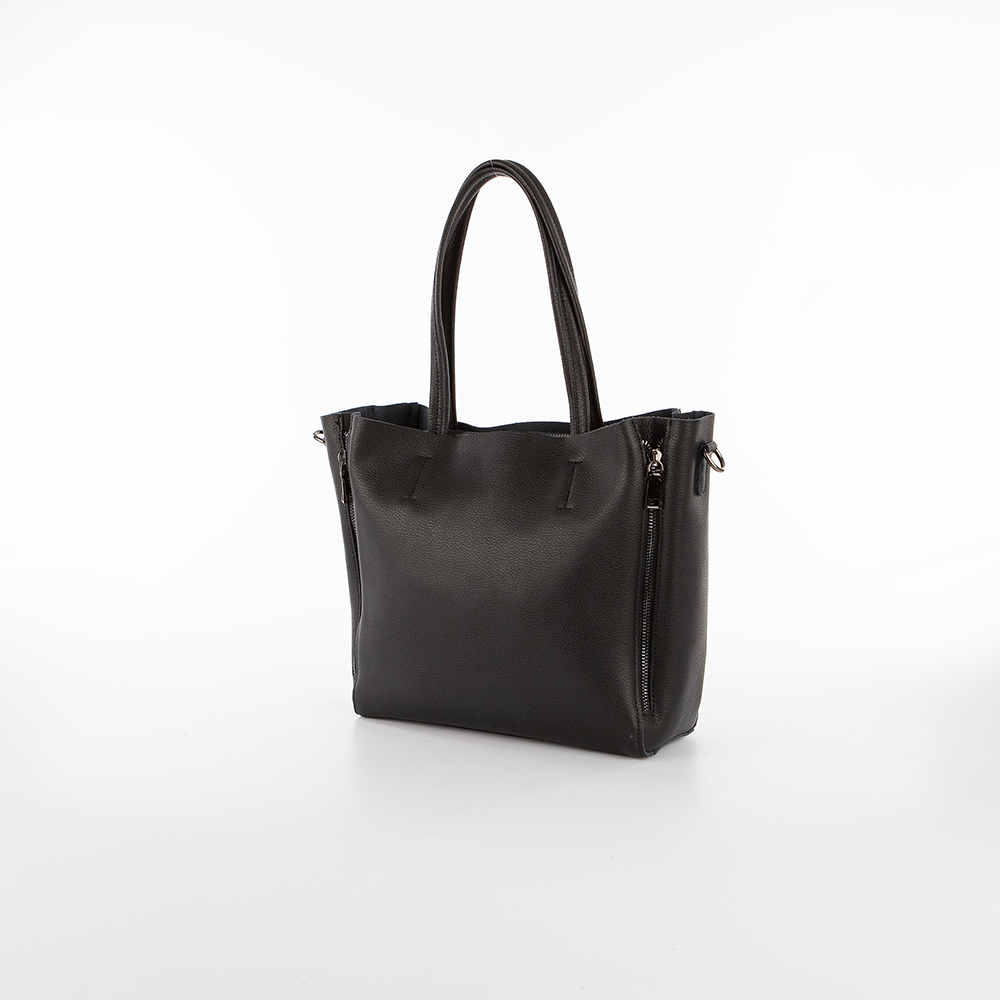 Сумка от торговой марки Poshete выполнена из натуральной кожи черного цвета. Модель с двумя ручками и съемным плечевым ремнем. Отделение на молнии. Внутри: фирменная подкладка, средник и карман на молнии, два накладных кармана. На лицевой стороне – накладной карман на кнопке. На задней стороне – карман на молнии. По бокам с обеих сторон имеются декоративные молнии.