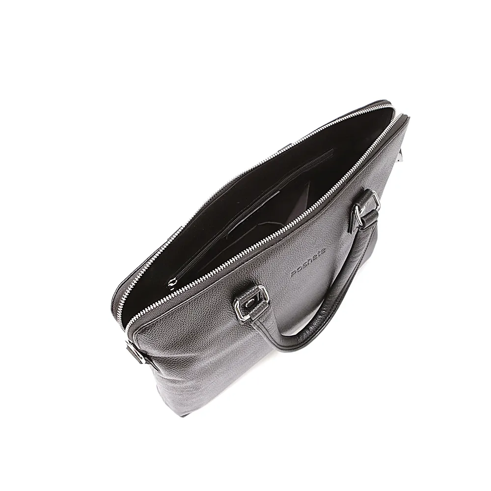 Сумка от торговой марки Poshete из натуральной кожи черного цвета. Плоская модель с двумя ручками и съемным регулируемым плечевым ремнем, выполненным из текстильного материала. Отделение на молнии. Внутри: фирменная подкладка, карман на молнии, два накладных кармана, карман с уплотненной стенкой для ноутбука. На задней стороне – карман на молнии. Размер подходит для документов формата А4.