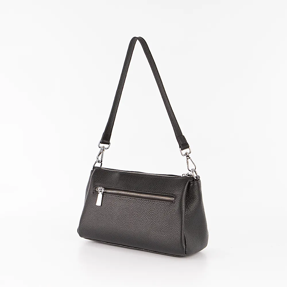 Сумка кросс-боди от торговой марки Poshete из натуральной кожи черного цвета. Модель со съемной ручкой и съемным регулируемым плечевым ремнем. Отделение на молнии. Внутри: текстильная подкладка, карман на молнии. На задней стороне – карман на молнии. Лицевая сторона с оригинальным лаконичным декором.