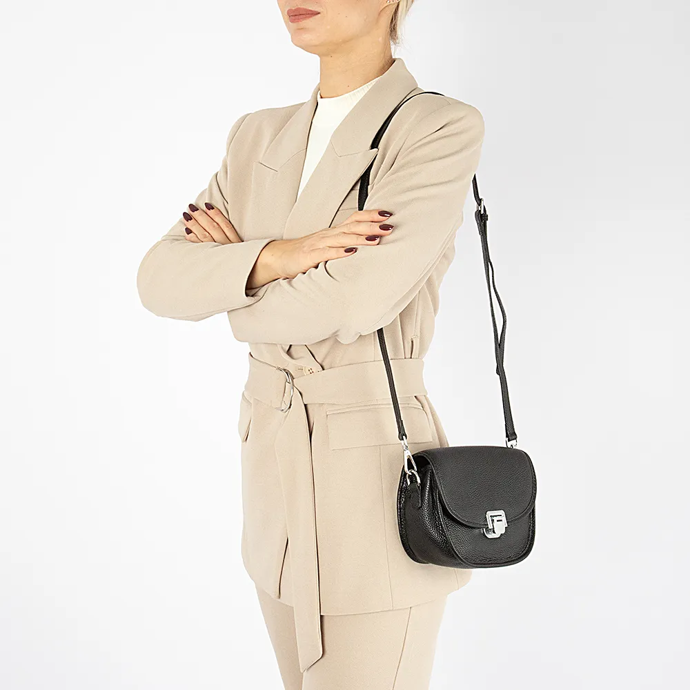 Сумка от торговой марки Poshete из натуральной кожи черного цвета. Модель со съемным регулируемым плечевым ремнем. Закрывается клапаном на поворотном замке. Отделение на молнии. Внутри: текстильная подкладка, карман на молнии, накладной карман.