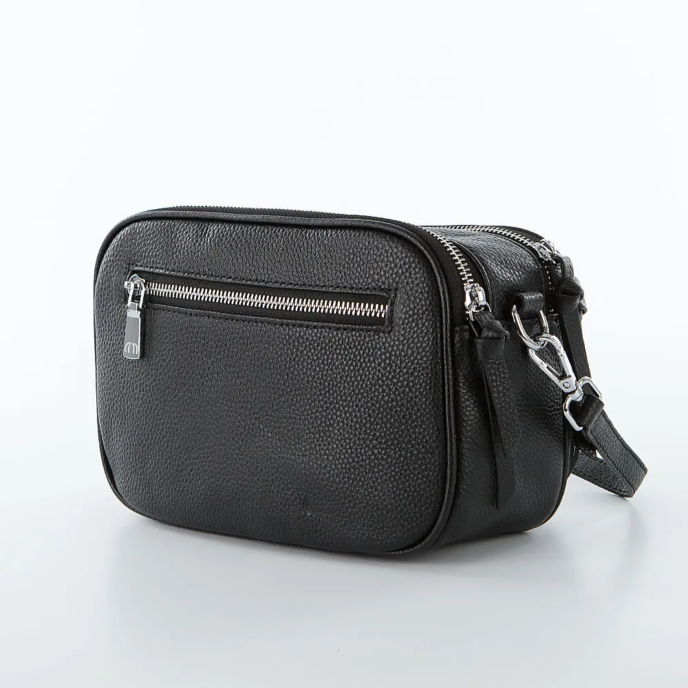 Сумка от торговой марки Poshete из натуральной кожи черного цвета. Модель со съемным регулируемым плечевым ремнем. Два отделения на молнии, с текстильной подкладкой. В одном из них – карман на молнии, в другом – накладной карман. На лицевой стороне – закругленный накладной карман на молнии. На задней стороне – карман на молнии.