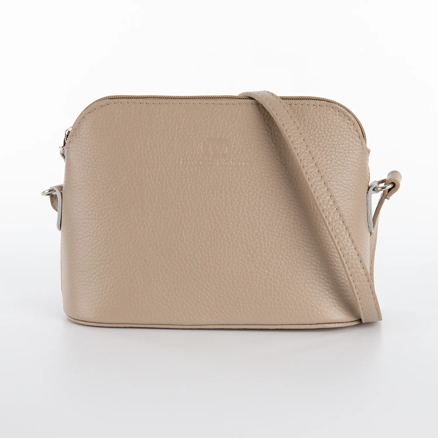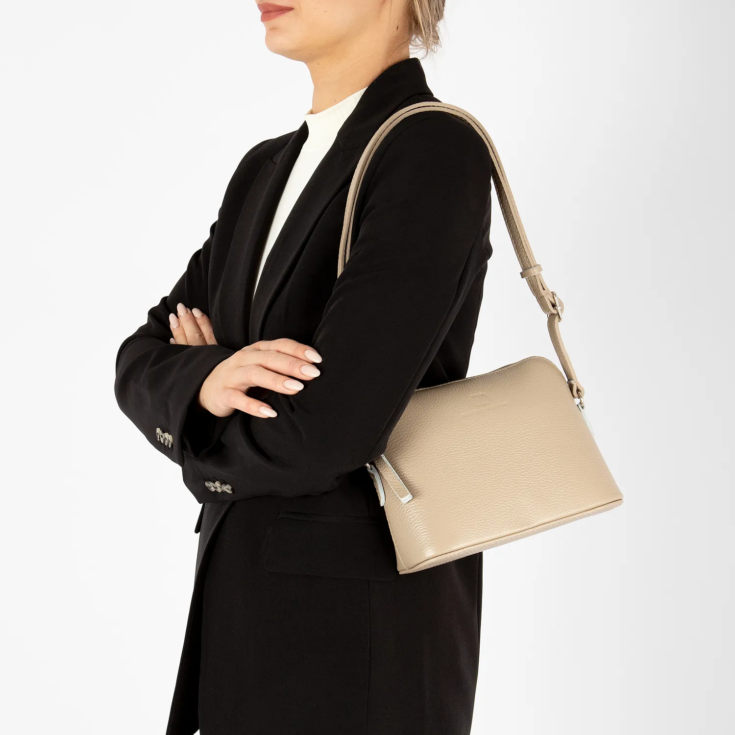 Сумка от торговой марки Francesco Molinary из натуральной зернистой кожи кофейного цвета. Модель с несъемным регулируемым плечевым ремнем. Отделение на молнии. Внутри: фирменная подкладка, карман на молнии, накладной карман. На задней стороне – карман на молнии.