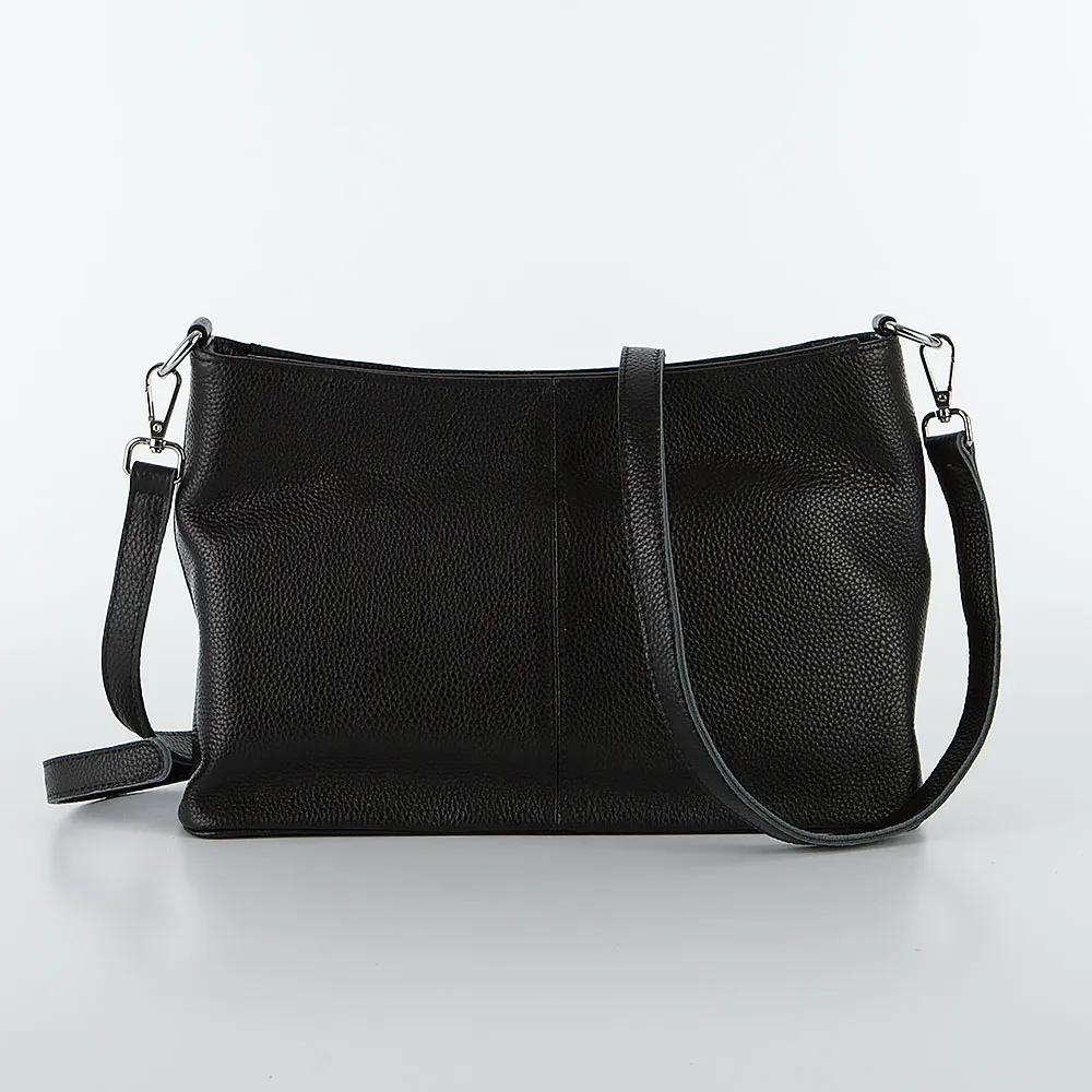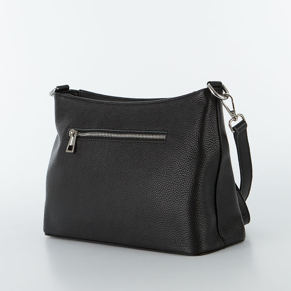 Сумка от торговой марки Poshete из натуральной кожи черного цвета. Модель со съемной ручкой и съемным регулируемым плечевым ремнем. Отделение на молнии. Внутри: фирменная подкладка, средник и карман на молнии, два накладных кармана. На задней стороне – карман на молнии. Дно оснащено металлическими ножками для защиты от износа.