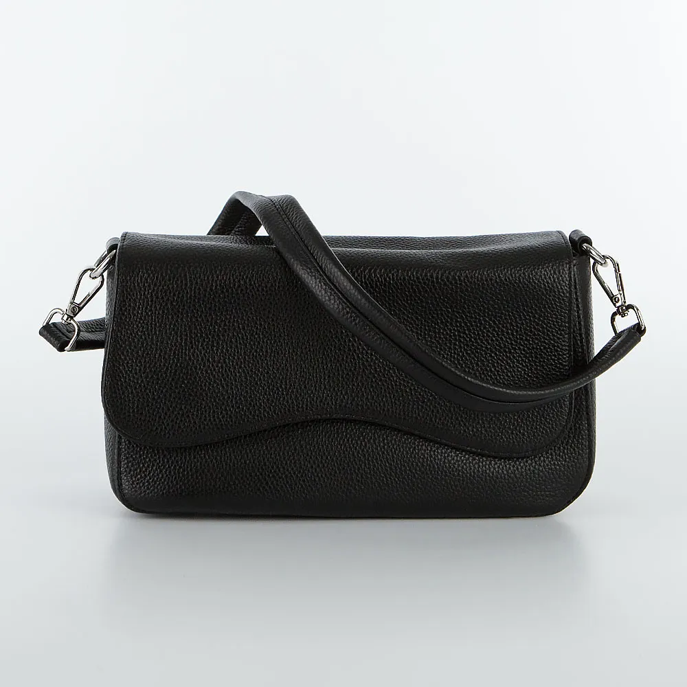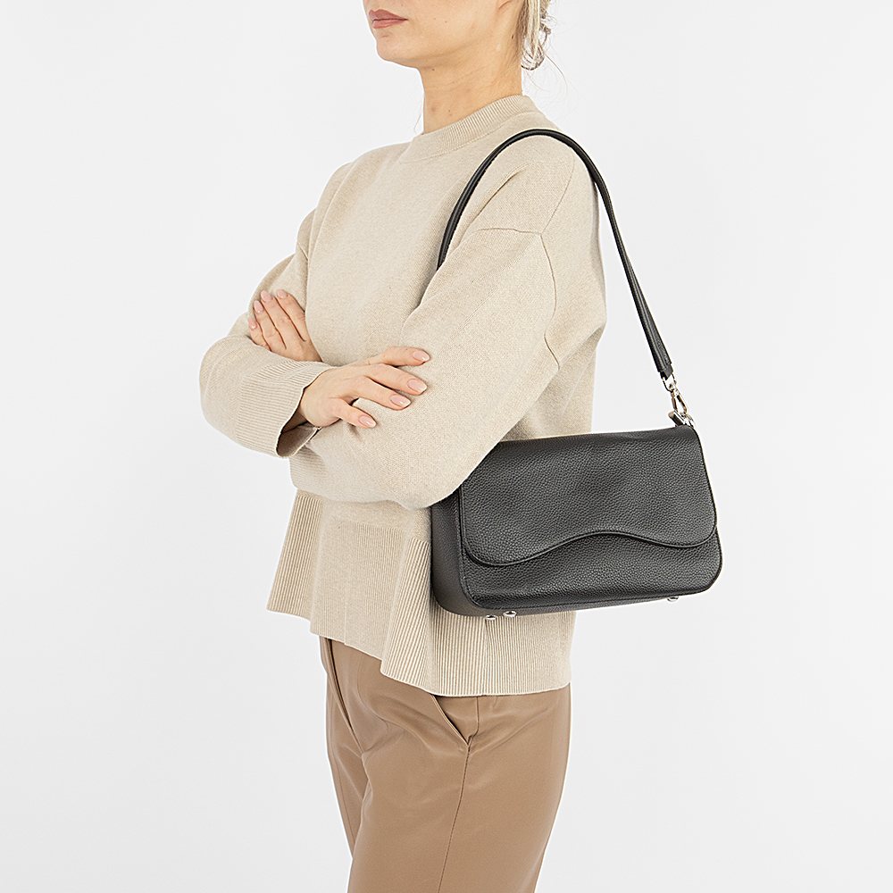 Сумка от торговой марки Poshete из натуральной кожи черного цвета. Модель со съемной ручкой и съемным регулируемым плечевым ремнем. Закрывается фигурным клапаном на двух магнитных кнопках. Отделение на молнии. Внутри: фирменная подкладка, средник и карман на молнии, накладной карман. На задней стороне – карман на молнии.