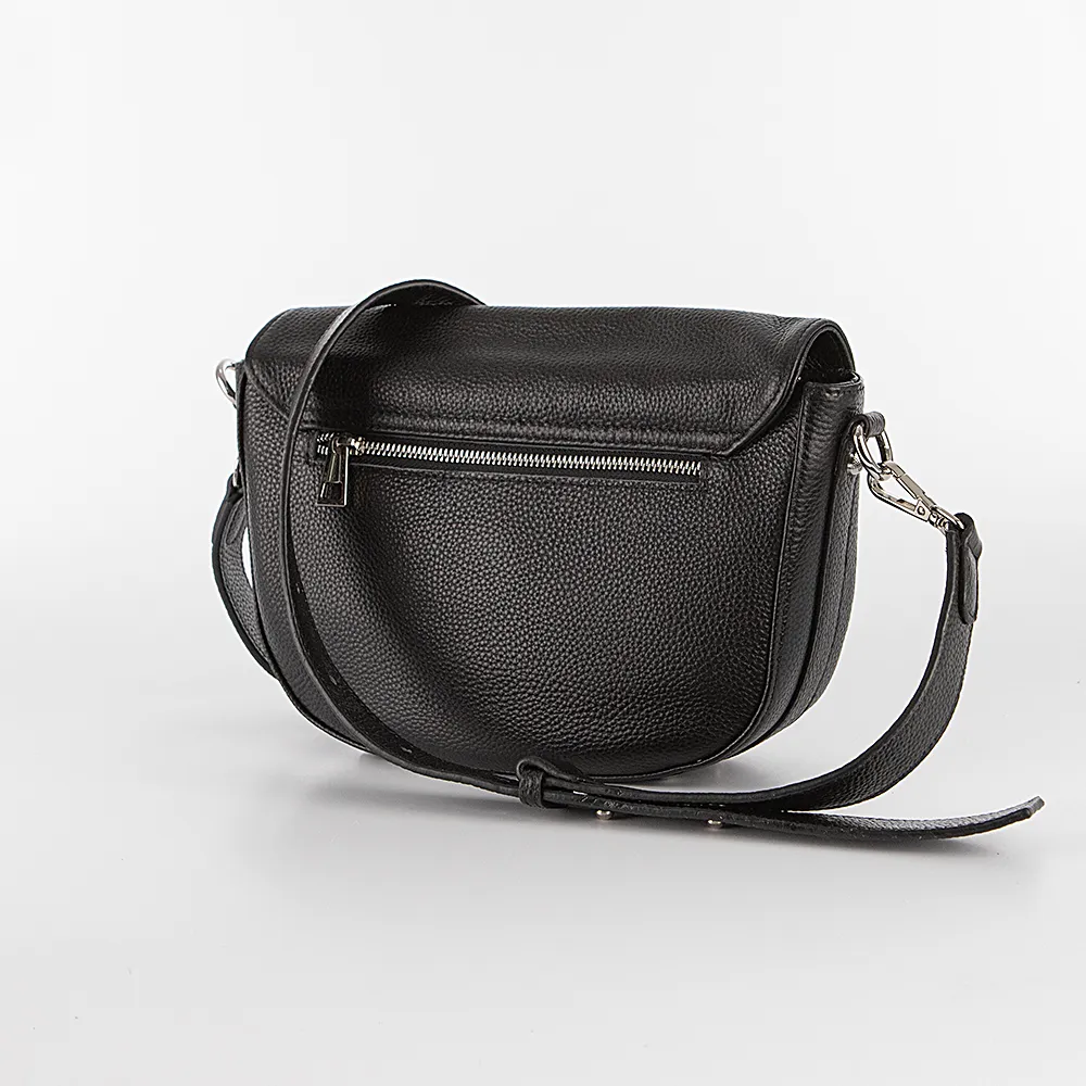 Сумка от торговой марки Poshete из натуральной кожи черного цвета. Модель с широким съемным регулируемым плечевым ремнем. Закрывается закругленным клапаном на магнитной кнопке. Отделение на молнии. Внутри: фирменная подкладка, средник и карман на молнии, накладной карман. На задней стороне – карман на молнии. Дно оснащено металлическими ножками для защиты от износа.