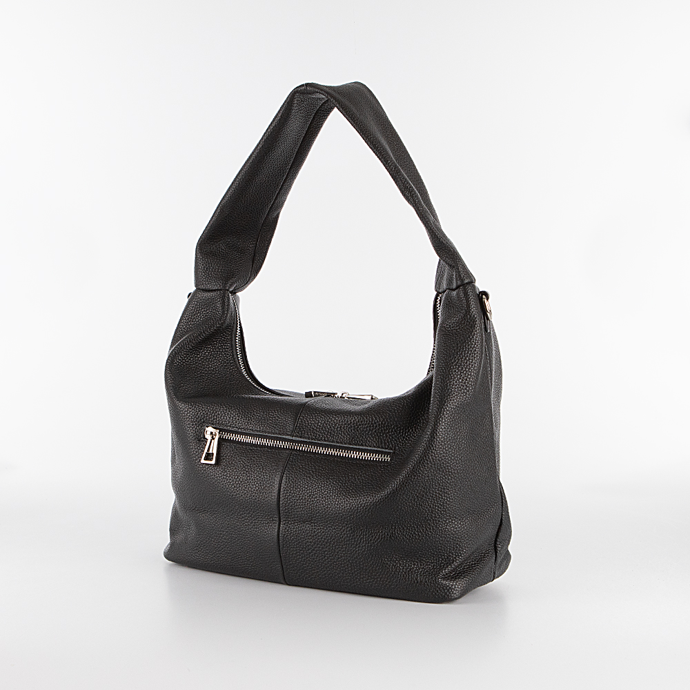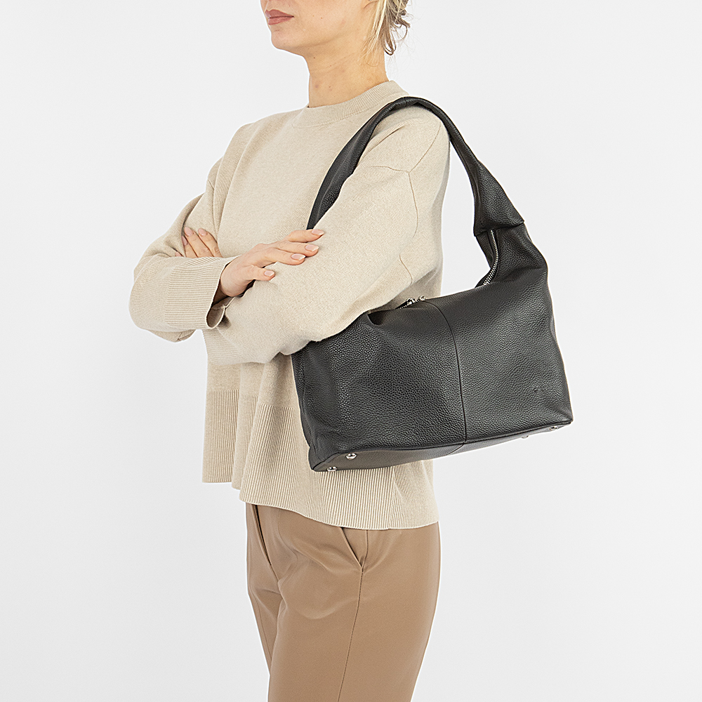 Сумка от торговой марки Poshete из натуральной кожи черного цвета. Модель с одной широкой ручкой. Отделение на молнии. Внутри: фирменная подкладка, средник и карман на молнии, два накладных кармана. На задней стороне – карман на молнии. Дно оснащено металлическими ножами для защиты от износа.