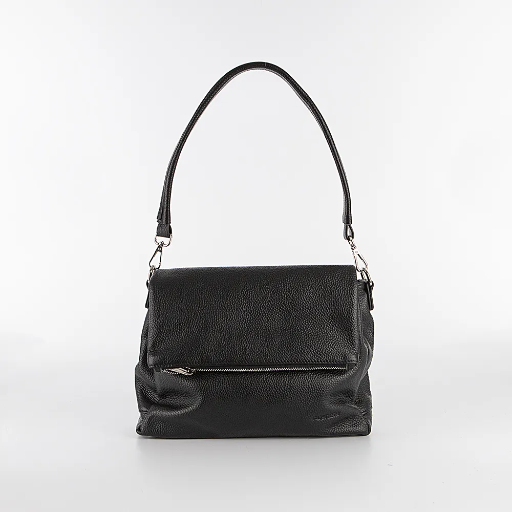 Сумка от торговой марки Poshete из натуральной зернистой кожи черного цвета. Практичная модель со съемной ручкой м съемным регулируемым плечевым ремнем. Клапан на двух магнитных кнопках с глубоким отделением на молнии закрывает три отделения на молнии. В среднем отделении – карман на молнии, два накладных кармана. На задней стороне – карман на молнии. Дно оснащено металлическими ножами для защиты от износа.