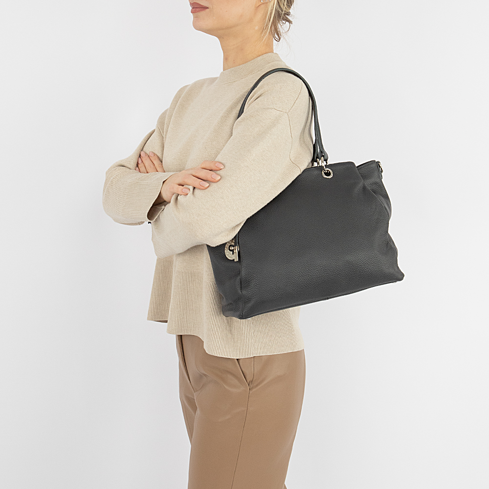 Сумка от торговой марки Poshete из натуральной кожи темно-серого цвета. Вместительная модель с двумя ручками, декорированными подвеской, и съемным регулируемым плечевым ремнем. Три отделения на молнии, с фирменной подкладкой. Среднее отделение широко раскрывается; внутри: карман на молнии, два накладных кармана. На задней стороне – карман на молнии. Дно оснащено металлическими ножами для защиты от износа.