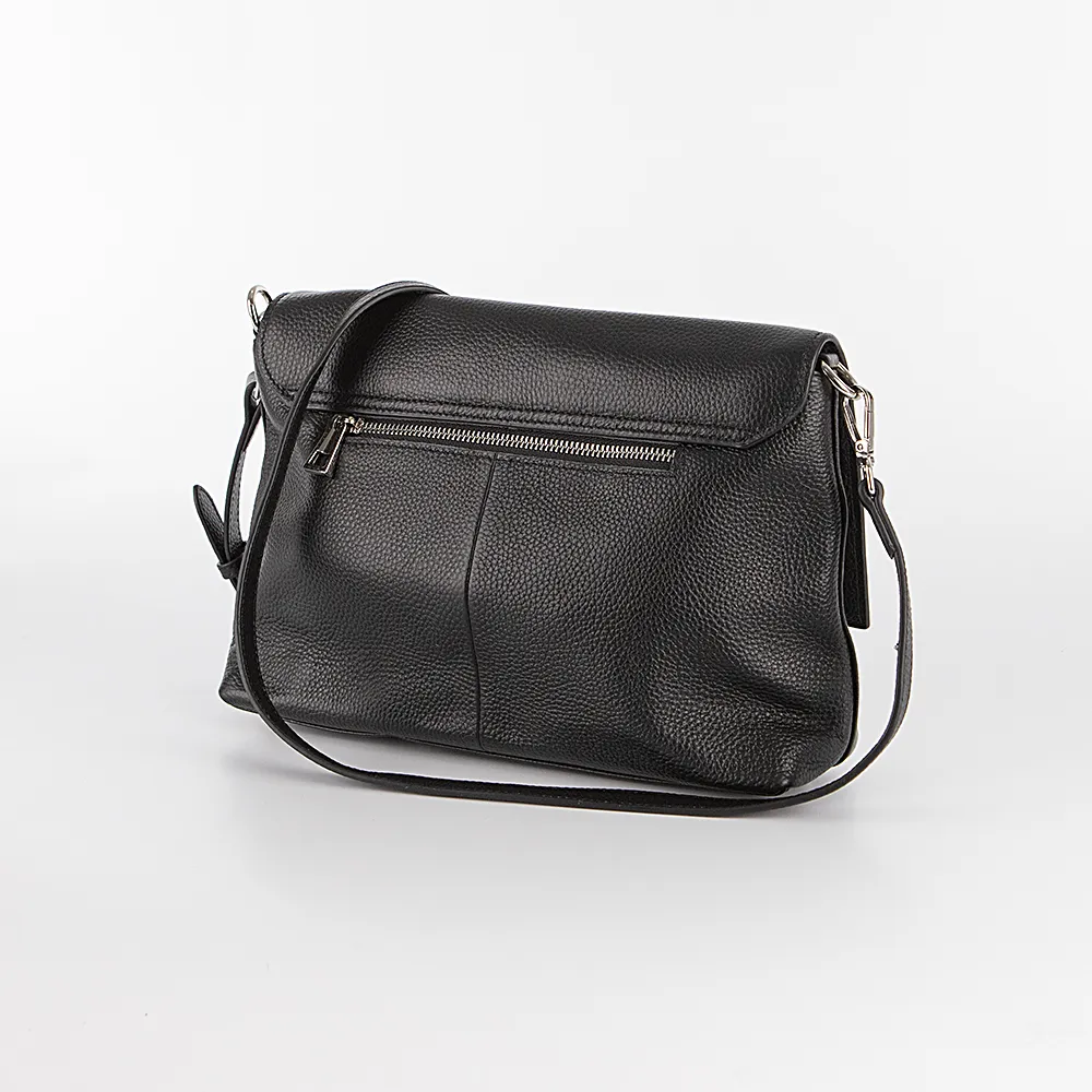 Сумка от торговой марки Poshete из натуральной кожи черного цвета. Модель со съемным регулируемым плечевым ремнем. Клапан на двух магнитных кнопках закрывает карман на молнии и отделение на молнии. В отделении: средник и карман на молнии, два накладных кармана. На задней стороне – карман на молнии.