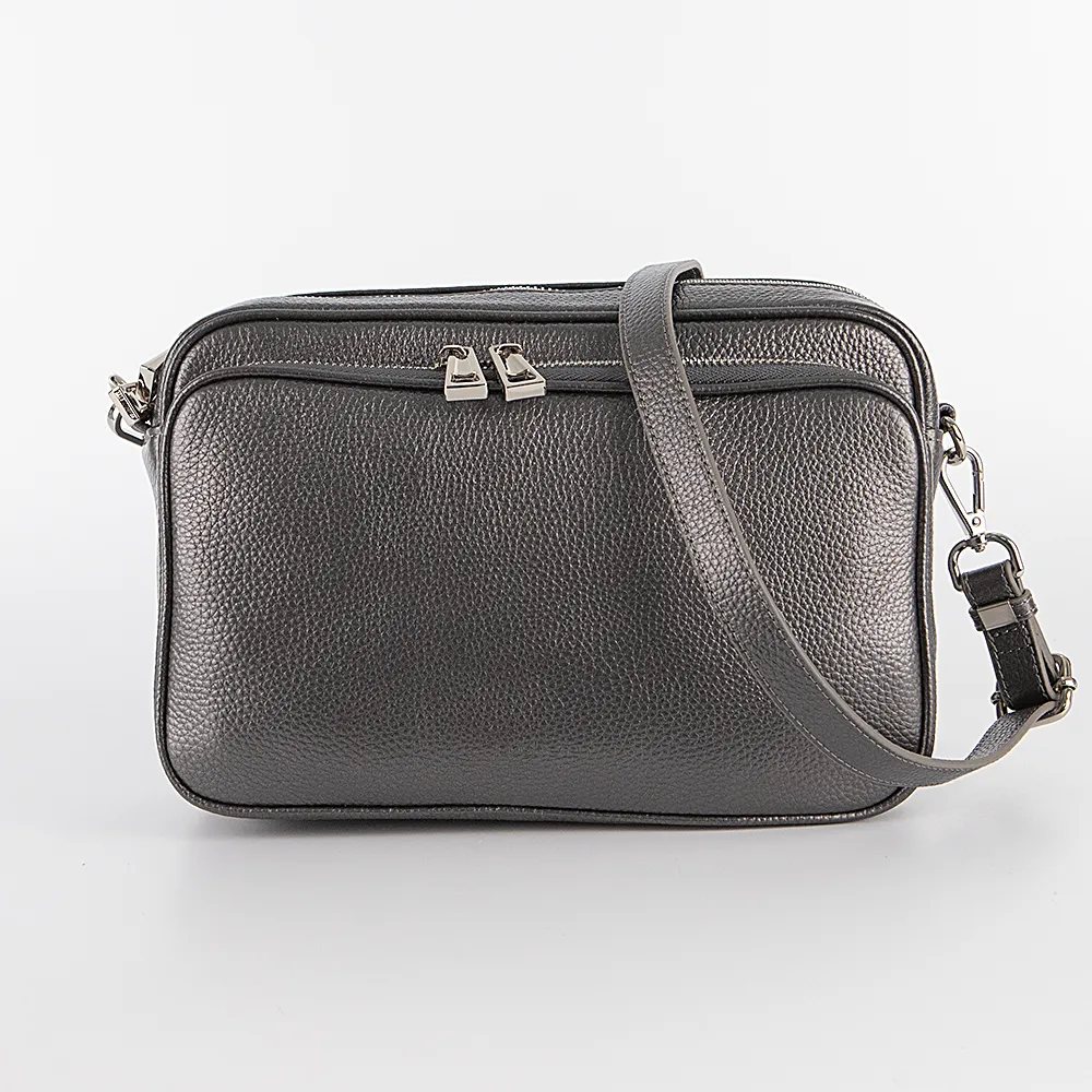 Сумка от торговой марки Poshete из натуральной кожи цвета «темное серебро». Модель со съемным регулируемым плечевым ремнем. Два отделения на молнии, с фирменной подкладкой. В основном отделении – карман на молнии, накладной карман. На задней стороне – карман на молнии.