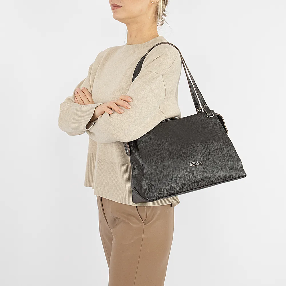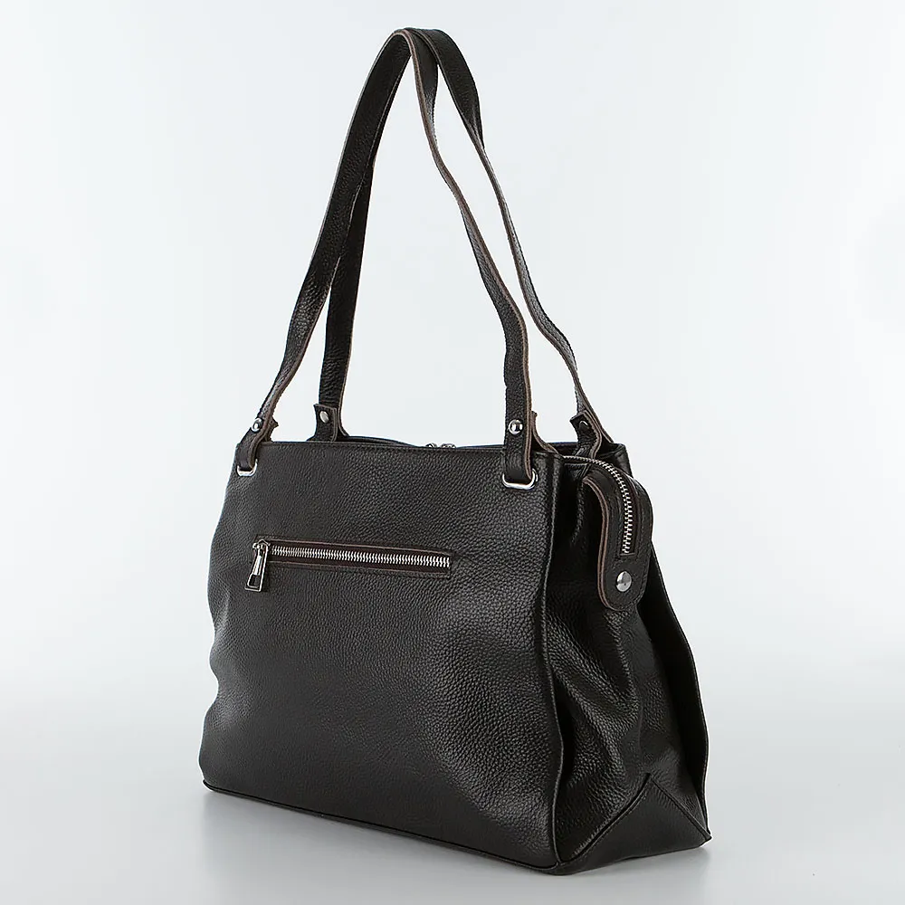 Сумка от торговой марки Poshete из натуральной кожи темно-коричневого цвета. Модель с двумя удлиненными ручками и съемным регулируемым плечевым ремнем. Три отделения с текстильной подкладкой. Крайние фиксируются магнитной кнопкой. Среднее отделение на молнии, которая крепится по бокам магнитными кнопками. Внутри: фирменная подкладка, средник и карман на молнии, два накладных кармана. На задней стороне – карман на молнии.