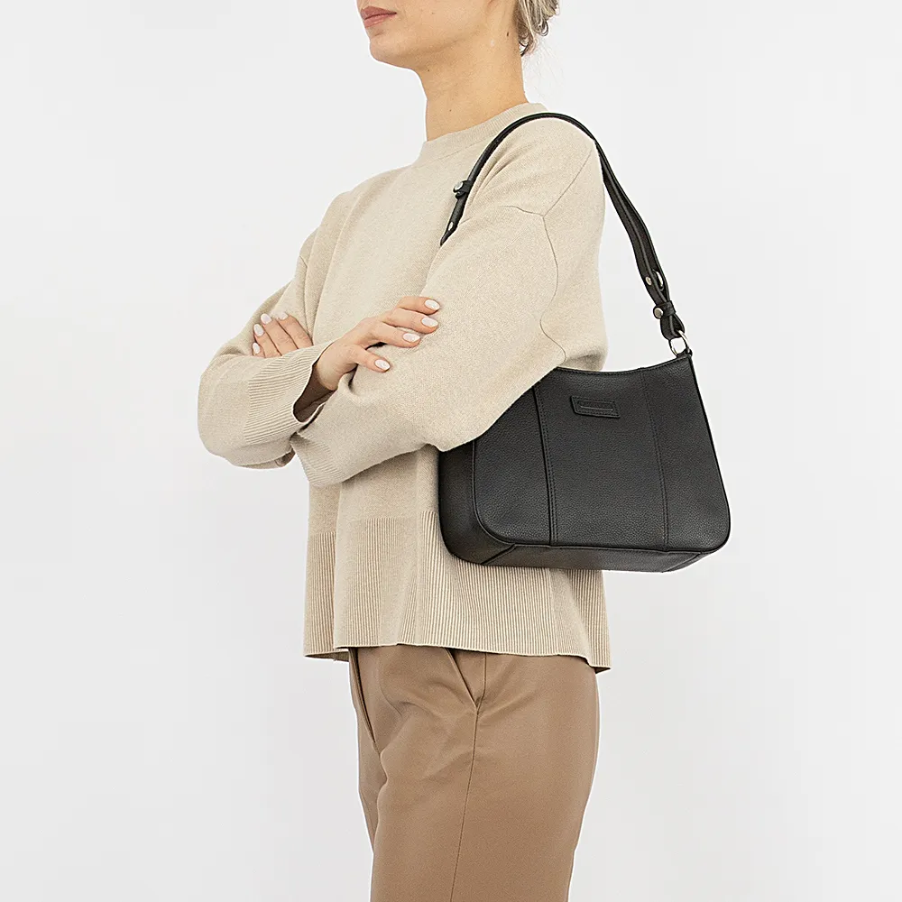 Сумка от торговой марки Francesco Molinary выполнена из натуральной кожи черного цвета. Модель с удлиненной регулируемой ручкой-ремнем. Отделение на молнии. Внутри: фирменная подкладка, средник и карман на молнии, два накладных кармана. На задней стороне – карман на молнии.