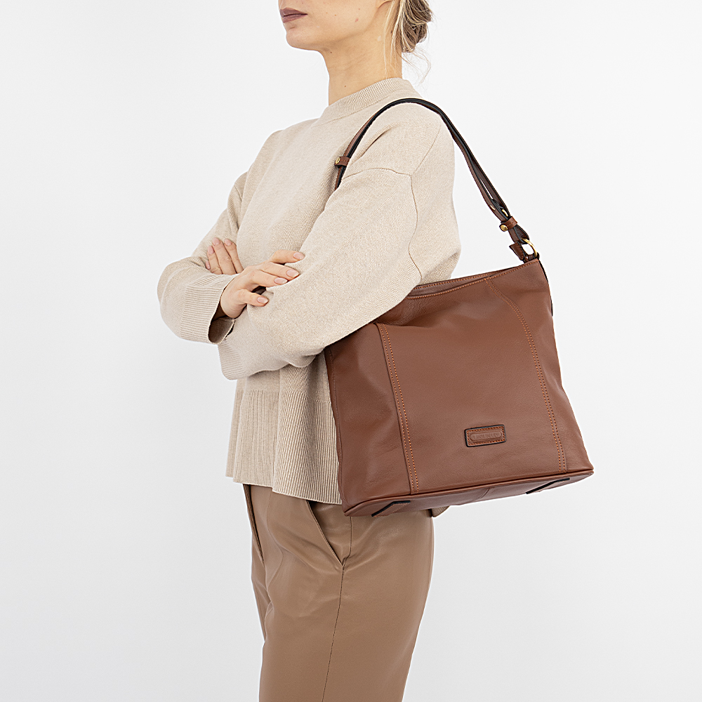 Сумка от торговой марки Francesco Molinary из натуральной кожи коричневого цвета. Модель с регулируемой съемной ручкой-ремнем. Отделение на молнии. Внутри: фирменная подкладка, средник и карман на молнии, два накладных кармана. На задней стороне – карман на молнии. На дне имеются кожаные нашивки для защиты от износа.