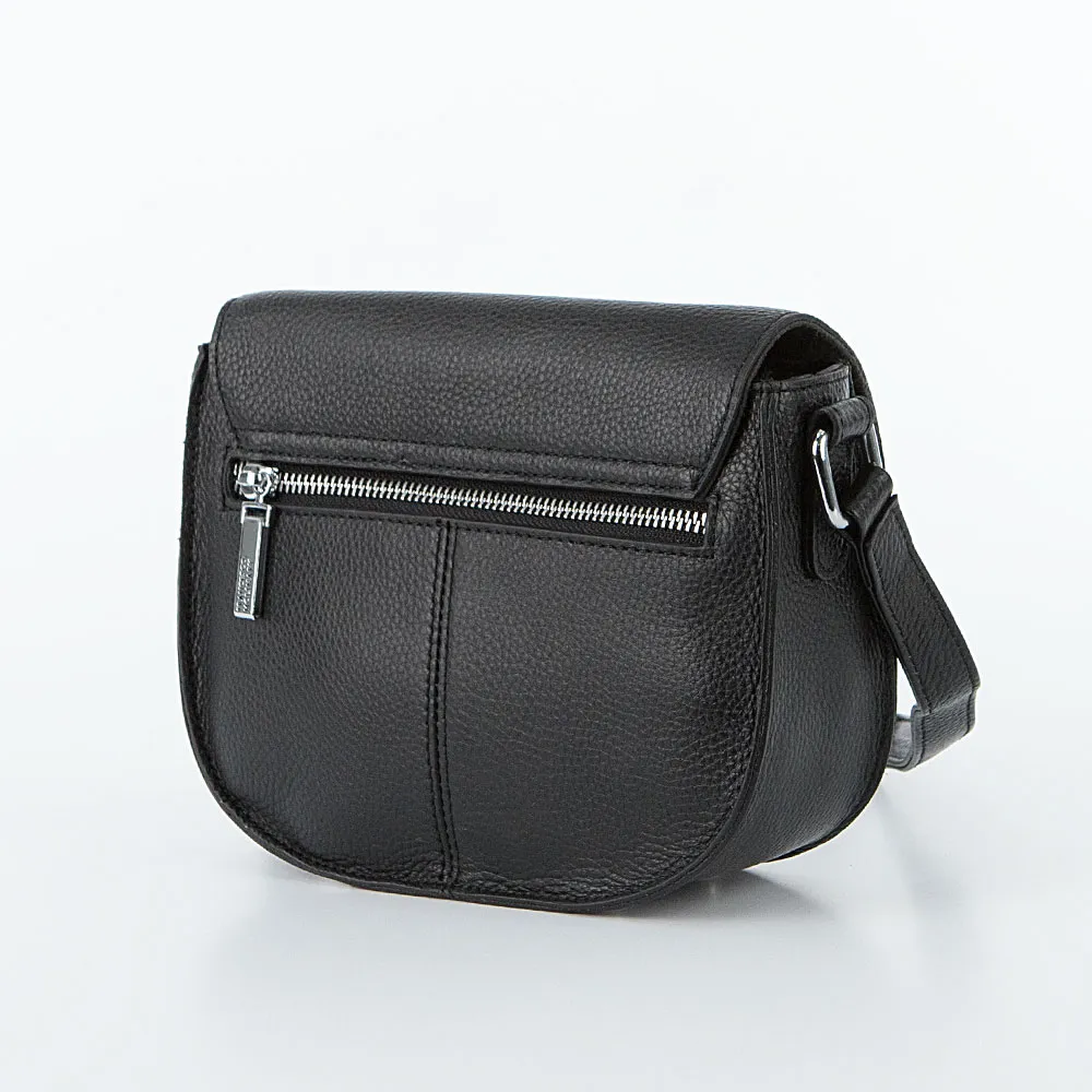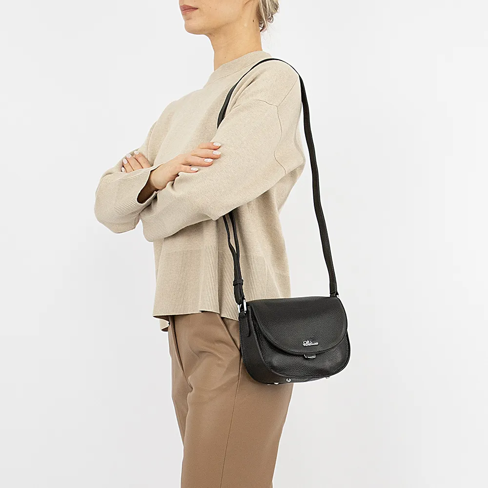 Сумка от торговой марки Francesco Molinary изготовлена из натуральной кожи черного цвета. Элегантная компактная модель с несъемным регулируемым плечевым ремнем. Закругленный клапан на цупферном замке закрывает накладной карман на кнопке и отделение. Внутри: фирменная подкладка, средник и карман на молнии, накладной карман. На задней – карман на молнии. Дно сумки оснащено металлическими ножками от износа.