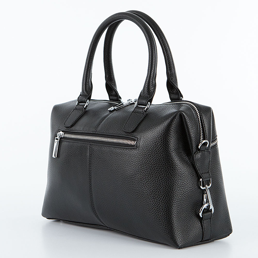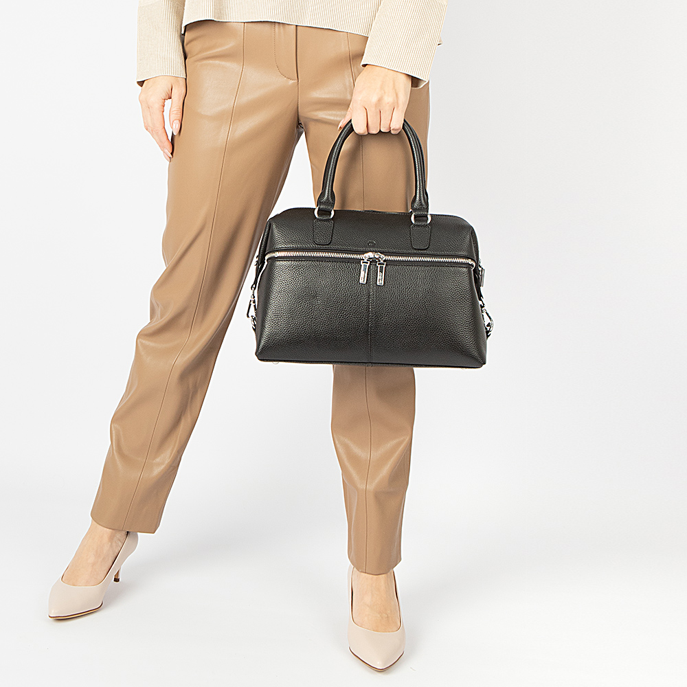 Сумка от торговой марки Francesco Molinary из натуральной кожи черного цвета. Модель с двумя ручками и съемным регулируемым плечевым ремнем. Отделение на молнии с двумя встречными бегунками. Внутри: фирменная подкладка, средник и карман на молнии, два накладных кармана. По бокам – карабины, с помощью которых можно менять объем и форму сумки. На лицевой и задней сторонах – карман на молнии. Дно сумки оснащено металлическими ножками от износа.